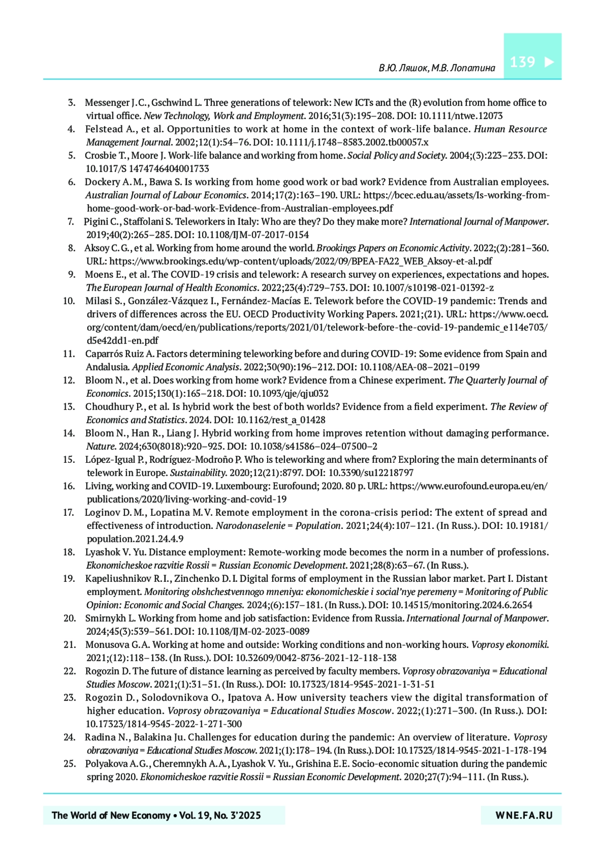 17. Логинов Д.М., Лопатина М.В. Дистанционная занятость в период коронакризиса: масштабы распространения и результативность внедрения. Народонаселение. 2021;24(4):107-121. https://doi.org/10.19181/population.2021.24.4.9