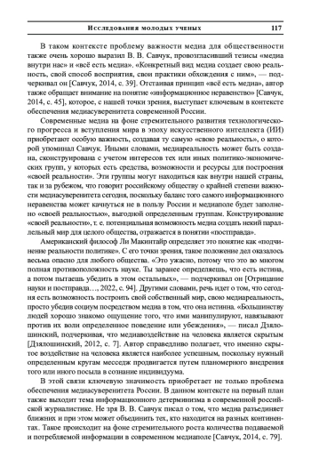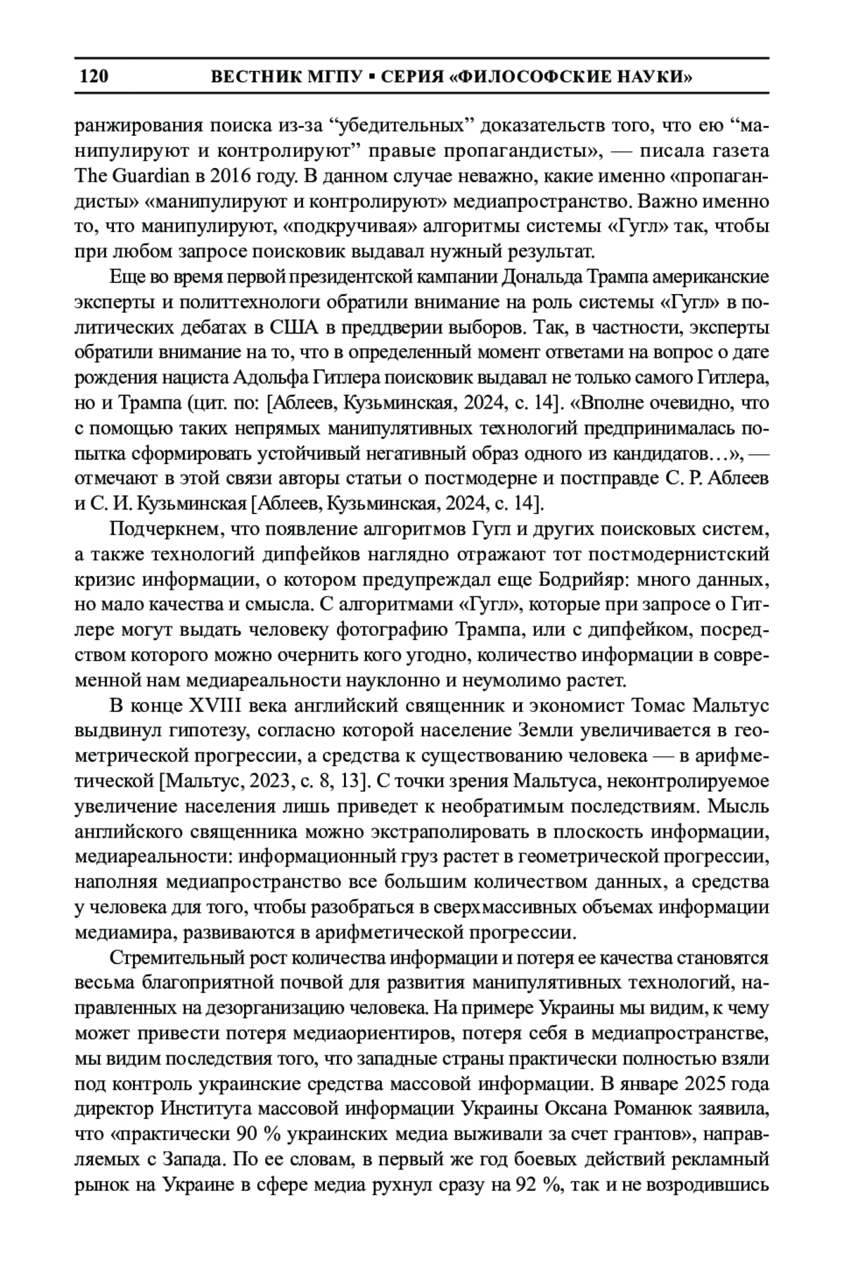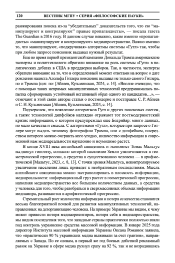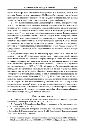 5. Аблеев С. Р., Кузьминская С. И. Постмодерн и постправда: манипулятивные технологии в формировании массового сознания // Психология и педагогика служебной деятельности. 2024. № 2. С. 12-16. DOI: 10.24412/2658-638X-2024-2-12-16 EDN: BXELJF