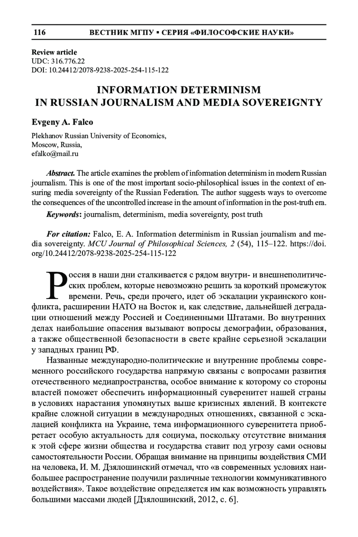 В статье рассматривается проблема информационного детерминизма в современной российской журналистике. Это один из наиболее важных социально-философских вопросов в контексте обеспечения медиасуверенитета Российской Федерации. Автор предлагает пути преодоления последствий неконтролируемого роста количества информации в эпоху постправды.