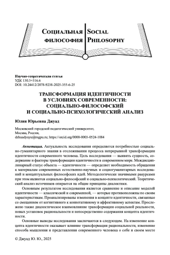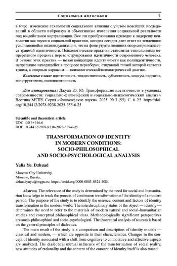 Актуальность исследования определяется потребностью социально-гуманитарного знания в отслеживании процесса непрерывной трансформации идентичности современного человека. Цель исследования - выявить сущность, содержание и факторы трансформации идентичности в современном мире. Междисциплинарный статус объекта - идентичности - определяет необходимость обращения к материалам современных естественно-научных и социогуманитарных исследований и концептуальных философских идей. Методологически значимыми ракурсами при этом являются социально-философский и социально-психологический. Теоретический анализ источников опирается на общие принципы диалектики.
