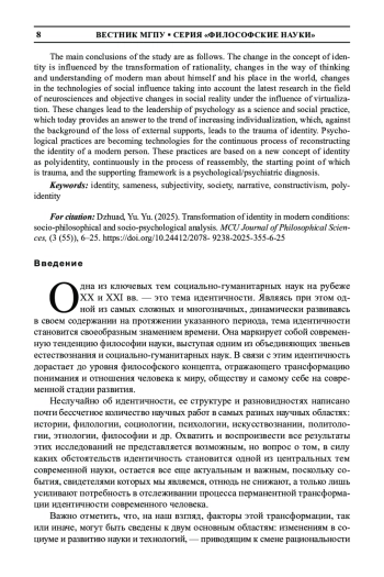 Одна из ключевых тем социально-гуманитарных наук на рубеже ХХ и XXI вв. — это тема идентичности. Являясь при этом одной из самых сложных и многозначных, динамически развиваясь в своем содержании на протяжении указанного периода, тема идентичности становится своеобразным знамением времени. Она маркирует собой современную тенденцию философии науки, выступая одним из объединяющих звеньев естест вознания и социально-гуманитарных наук. В связи с этим идентичность дорастает до уровня философского концепта, отражающего трансформацию понимания и отношения человека к миру, обществу и самому себе на современной стадии развития.