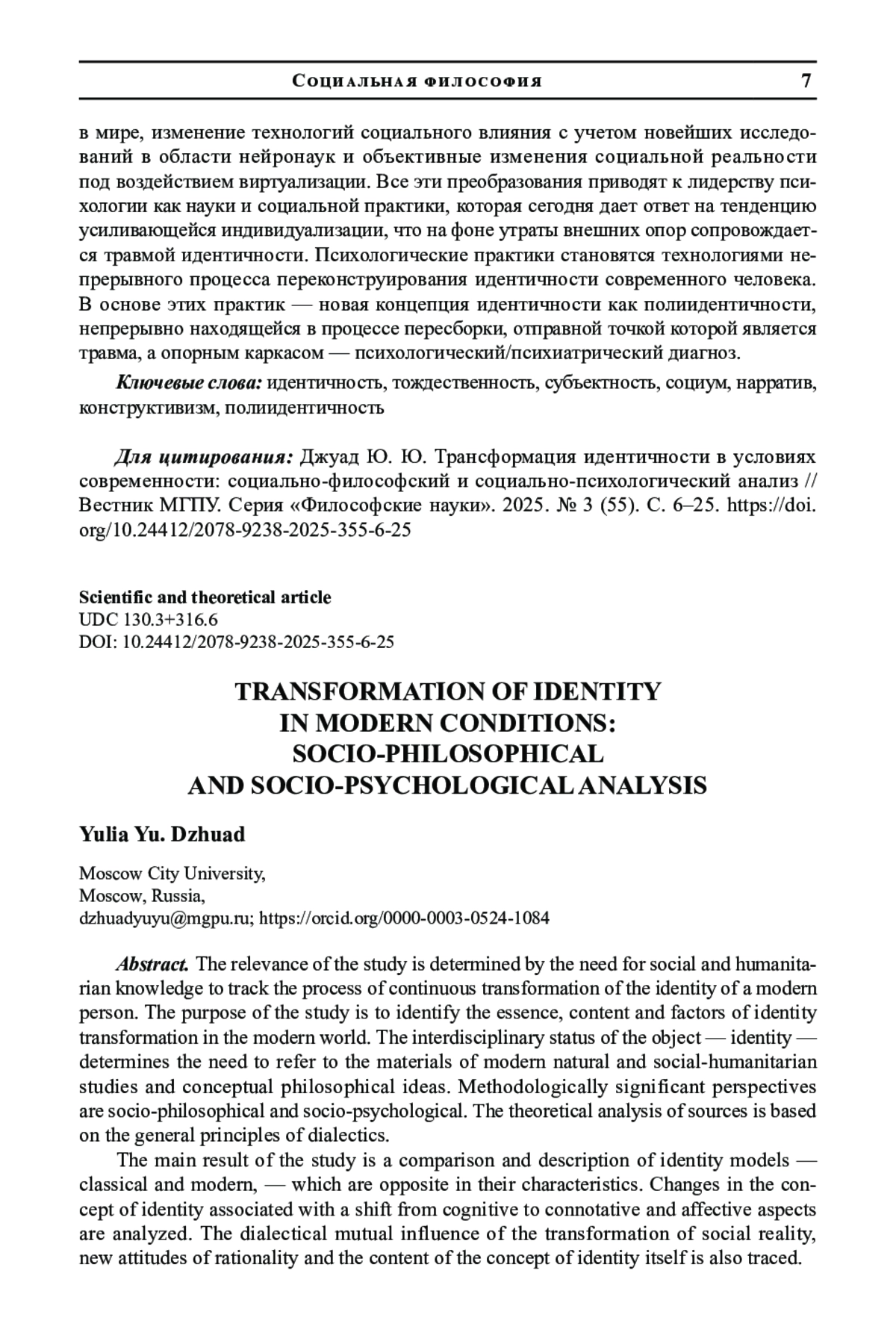 1. Халикова Д. А. Идентичность как объект рефлексии: социально-философский аспект // Медицина. Социология. Философия. Прикладные исследования. № 6. 2020. С.139-143. EDN: CGPMNJ