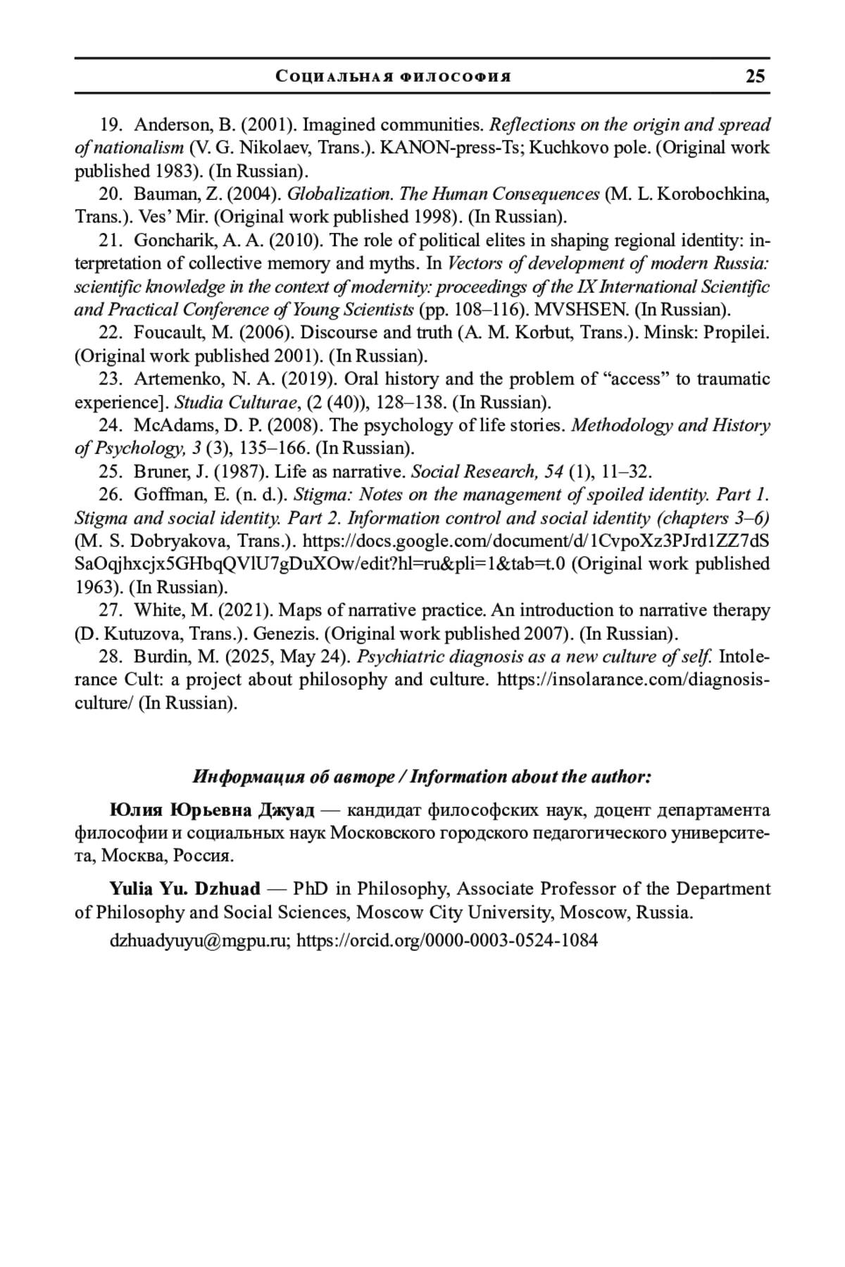 25. Bruner J. Life as narrative // Social Research. 1987. Vol. 54. № 1. P. 11-32.