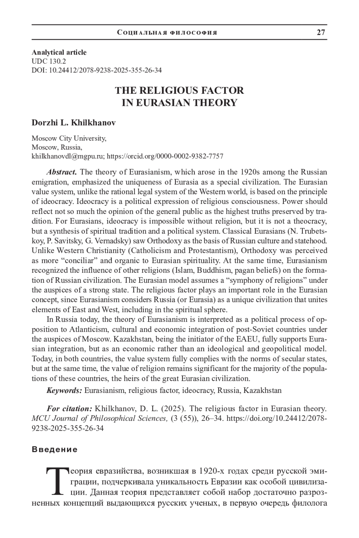 ХИЛХАНОВ Д. Л. РЕЛИГИОЗНЫЙ ФАКТОР В ЕВРАЗИЙСКОЙ ТЕОРИИ // ВЕСТНИК МГПУ. СЕРИЯ: ФИЛОСОФСКИЕ НАУКИ. 2025. № 3 (55)