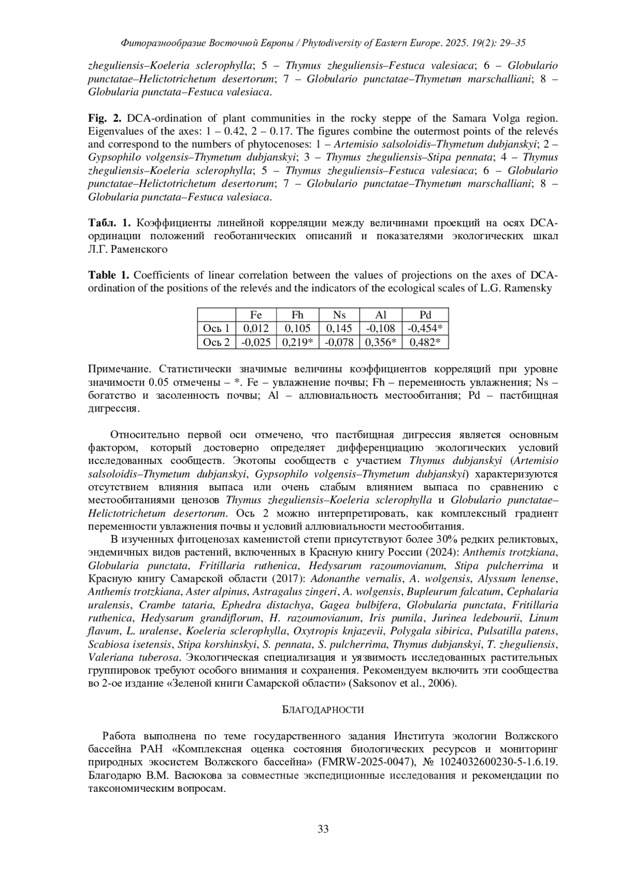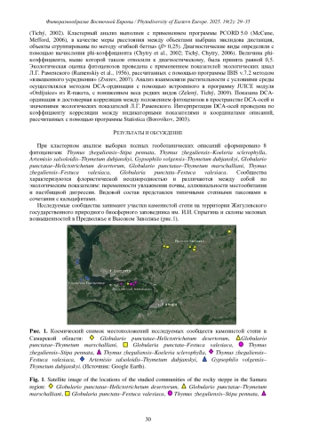 На каменистых местоположениях Самарской области формируются редкие, нуждающихся в охране растительные сообщества с высоким обилием узколокальных эндемичных видов: Thymus zheguliensis Klokov et Des.-Shost., T. dubjanskyi Klokov et Des.-Shost., Globularia punctata Lapeyr. С позиции подхода Браун-Бланке характеризуются сообщества: Thymus zheguliensis - Stipa pennata, Thymus zheguliensis - Koeleria sclerophylla, Artemisio salsoloidis-Thymetum dubjanskyi, Gypsophilо volgensis-Thymetum dubjanskyi, Globulario punctatae-Helictotrichetum desertorum, Globulario punctatae-Thymetum marschalliani, Thymus zheguliensis-Festuca valesiaca, Globularia punctata-Festuca valesiaca. Приводится DCA-ординация положений описаний сообществ и корреляция с показателями экологических шкал Л. Г. Раменского. Выявлены флористические и экологические особенности изученных сообществ каменистой степи.