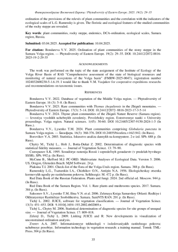 1. [Bondareva] Бондарева В.В. 2022. База данных растительности Среднего Поволжья. - Фиторазнообразие Восточной Европы. 16 (3): 5-9. DOI: 10.24412/2072-8816-2022-16-3-5-9 EDN: FTFYFH