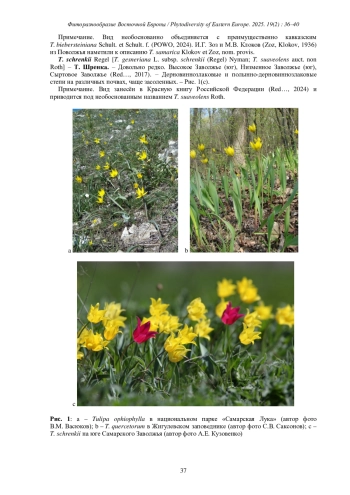 В результате критического изучения гербарных материалов (LE, MW, PVB, SMR), литературных источников (Plaksina, 2001; Saksonov, Senator, 2012; Vasjukov, 2024 et al.) и собственных полевых исследований на территории Самарской области нами достоверно приводится три дикорастущих вида рода Tulipa: T. ophiophylla Klokov et Zoz, T. quercetorum Klokov et Zoz и T. schrenkii Regel. Ранее для Сыртового Заволжья (урочище Грызлы) указаны еще два вида – T. biflora Pall. и T. patens C. Agardh (Red…, 2007; Kuzovenko, Plaksina, 2009); необходимо уточнение, т. к. гербарные образцы не известны. Ближайшие местонахождения T. biflora расположены южнее Оренбурга, в Соль-Илецком районе (Ryabinina, Knyazev, 2009), T. patens – югозападносибирсковосточноказахстанский вид известен восточнее Оренбурга (Ryabinina, Knyazev, 2009), возможно, отсутствует в Европейской России, хотя и указан для Волжско-Донского района европейской части СССР (Mordak, 1979) и Саратовской области (Mayevskiy, 2014). Во «Флоре Нижнего Поволжья» (Sagalaev, 2006) вид приведен широко и неоднозначно.