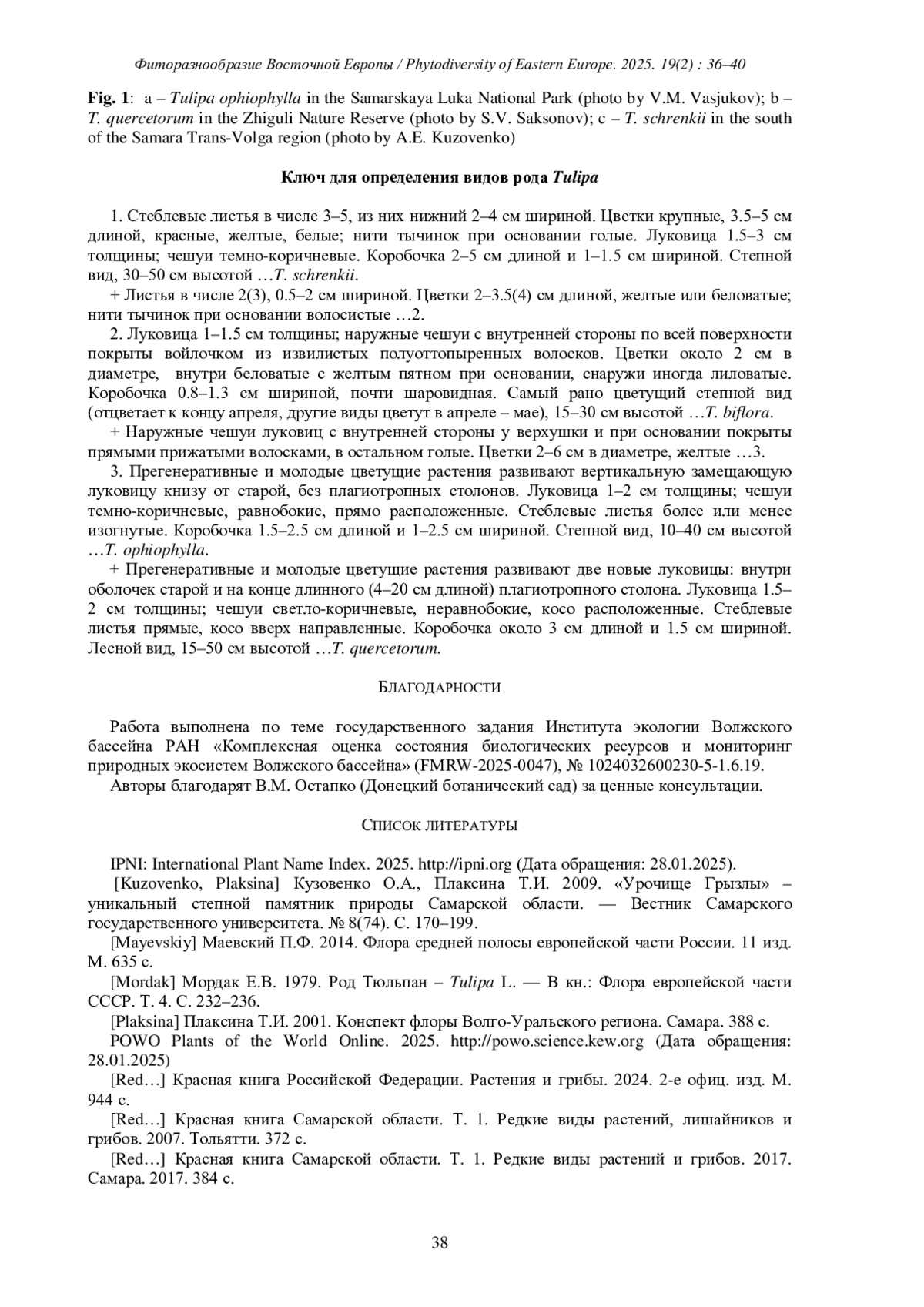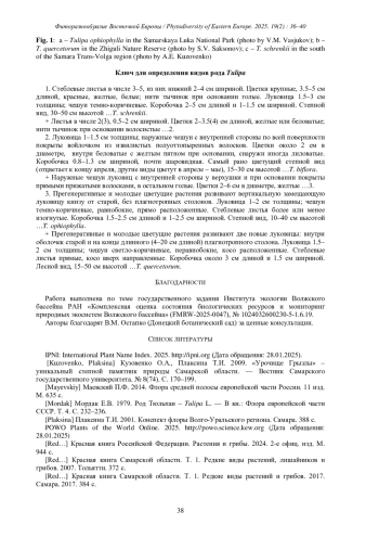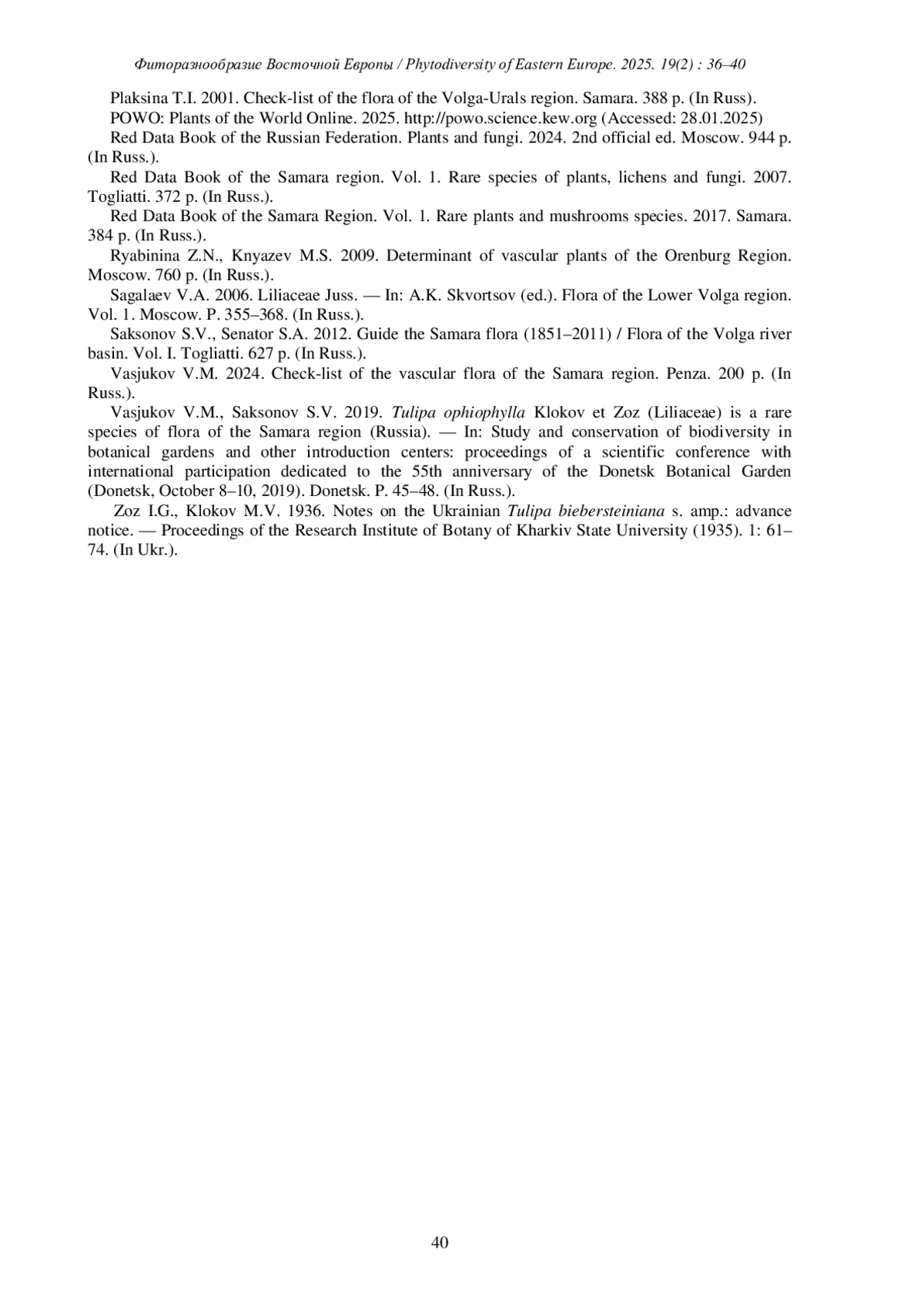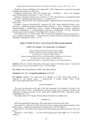 14. [Vasjukov, Saksonov] Васюков В.М., Саксонов С.В. 2019. Tulipa ophiophylla Klokov et Zoz (Liliaceae) - редкий вид флоры Самарской области (Россия). - В кн.: Изучение и сохранение биоразнообразия в ботанических садах и других интродукционных центрах: материалы научной конференции с международным участием, посвященной 55-летию Донецкого ботанического сада (г. Донецк, 8-10 октября 2019 г.). Донецк. С. 45-48. EDN: SBZOKC