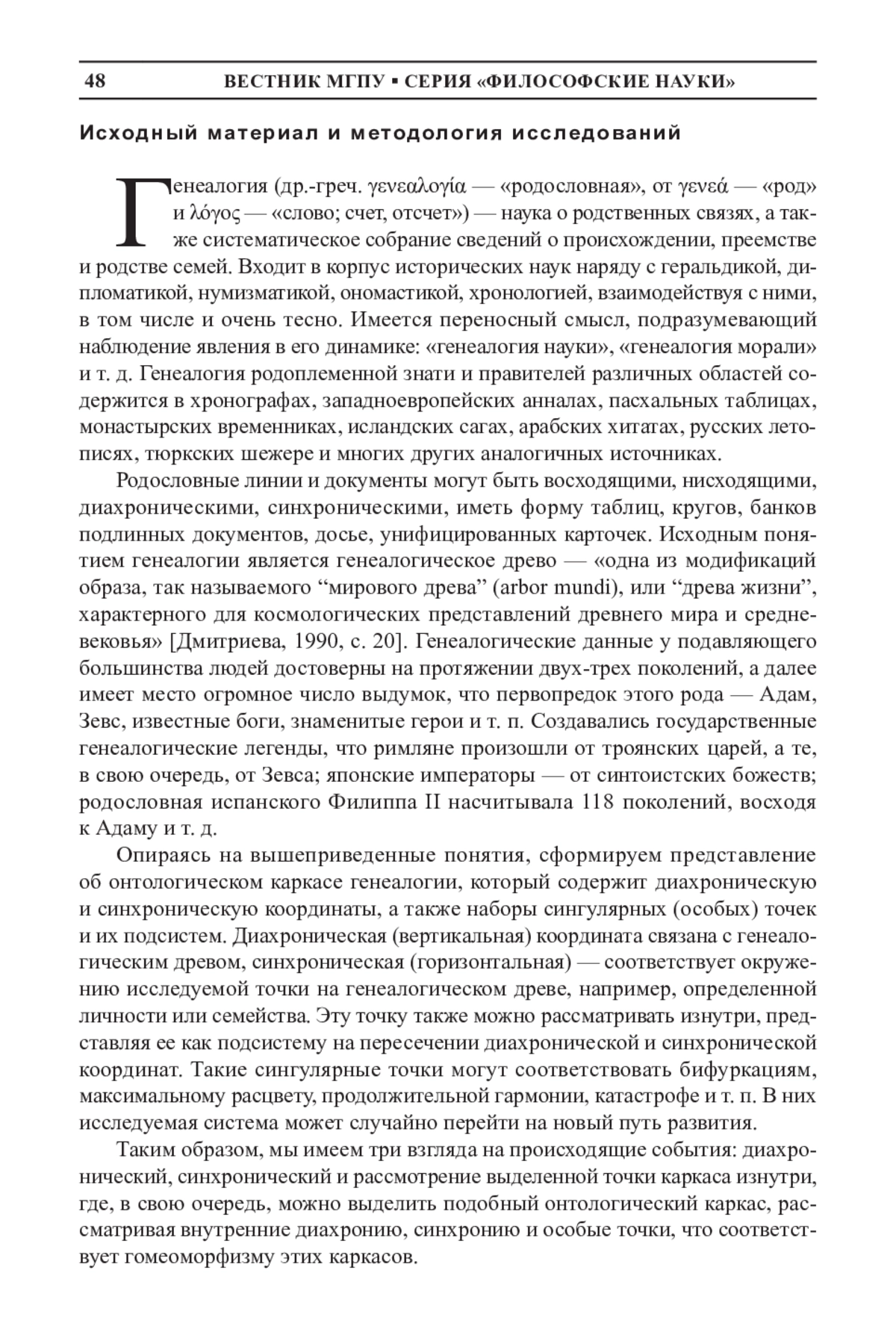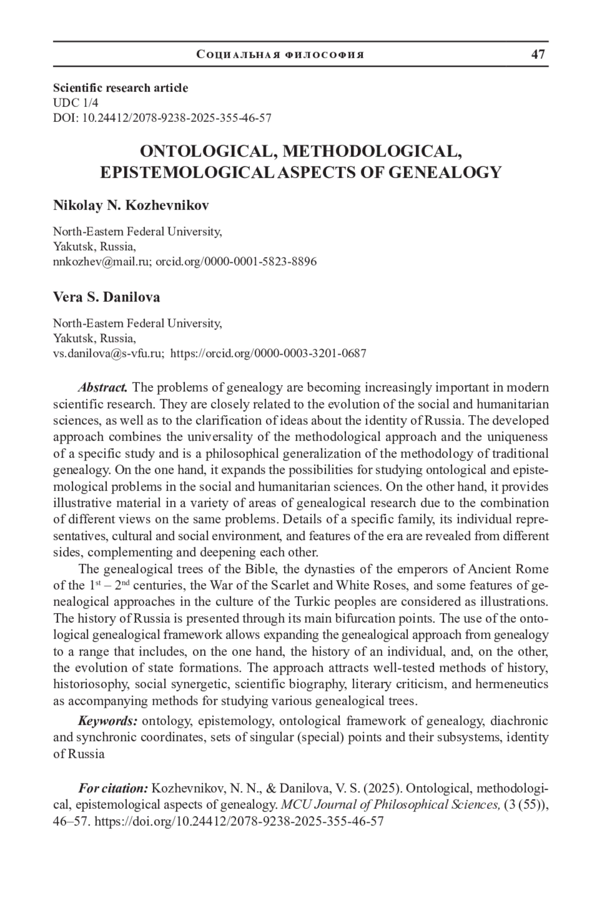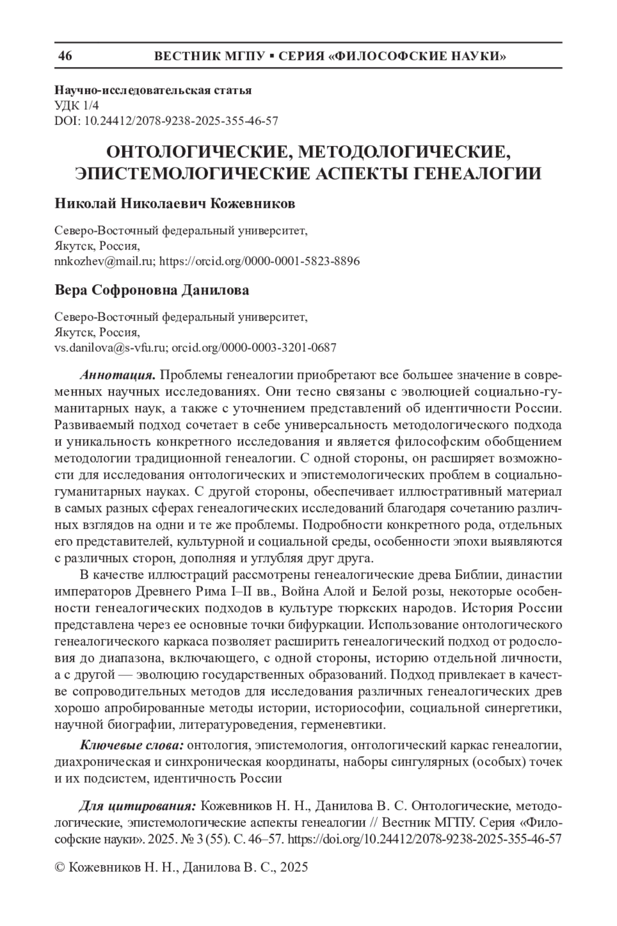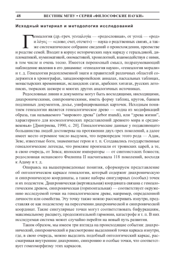 Проблемы генеалогии приобретают все большее значение в современных научных исследованиях. Они тесно связаны с эволюцией социально-гуманитарных наук, а также с уточнением представлений об идентичности России. Развиваемый подход сочетает в себе универсальность методологического подхода и уникальность конкретного исследования и является философским обобщением методологии традиционной генеалогии. С одной стороны, он расширяет возможности для исследования онтологических и эпистемологических проблем в социально-гуманитарных науках. С другой стороны, обеспечивает иллюстративный материал в самых разных сферах генеалогических исследований благодаря сочетанию различных взглядов на одни и те же проблемы. Подробности конкретного рода, отдельных его представителей, культурной и социальной среды, особенности эпохи выявляются с различных сторон, дополняя и углубляя друг друга. В качестве иллюстраций рассмотрены генеалогические древа Библии, династии императоров Древнего Рима вв., Война Алой и Белой розы, некоторые особенности генеалогических подходов в культуре тюркских народов. История России представлена через ее основные точки бифуркации. Использование онтологического генеалогического каркаса позволяет расширить генеалогический подход от родословия до диапазона, включающего, с одной стороны, историю отдельной личности, а с другой - эволюцию государственных образований. Подход привлекает в качестве сопроводительных методов для исследования различных генеалогических древ хорошо апробированные методы истории, историософии, социальной синергетики, научной биографии, литературоведения, герменевтики.
