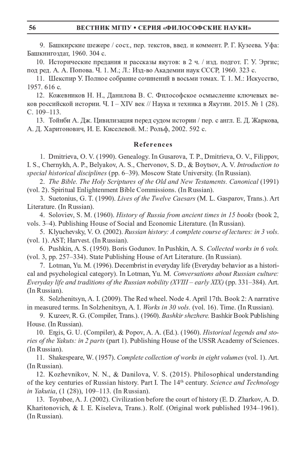 12. Кожевников Н. Н., Данилова В. С. Философское осмысление ключевых веков российской истории. Ч. I - XIV век // Наука и техника в Якутии. 2015. № 1 (28). C. 109-113. EDN: YYJIMP