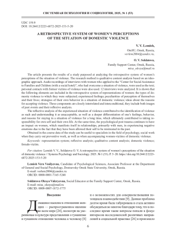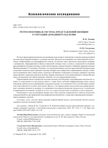 В статье представлены результаты исследования, цель которого заключалась в анализе ретроспективной системы представлений женщин о ситуации насилия. Методом исследования стал качественный контентана лиз, базирующийся на идеографическом подходе. В качестве текста выступили аудиозаписи интервью с женщинами, обращавшимися в Центр социальной помощи семье и детям (с социальной гостиницей), преодолевшими ситуацию насилия; а также использовались личные контакты с бывшими жертвами насилия. Проанализировано 12 интервью. Показано, что в ретроспективную систему представлений женщин входят следующие элементы: виды домашнего насилия, которым они подвергались; переживаемые чувства; особенности восприятия себя и своей жизни; стратегии собственного поведения в ситуации домашнего насилия; представления о причинах принятия насилия. Данные компоненты тесно взаимосвязаны и взаимообусловлены; они включают как образы прошлых событий, так и их рефлексивный анализ.