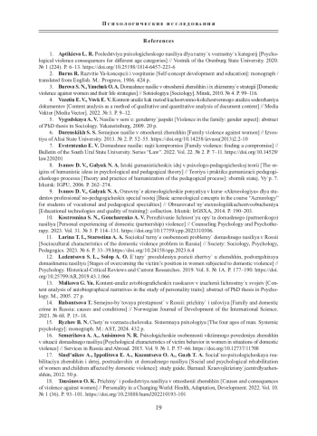 21. Шимановская Я. В., Сарычев А. С., Гольдзин Е. Индивидуально-психологические особенности женщин молодого и среднего возраста, подвергшихся домашнему насилию: опыт социально-педагогического исследования // ЦИТИСЭ. 2021. № 4 (30). С. 431-440. DOI: 10.15350/24097616.2021.4.40 EDN: PMESZK