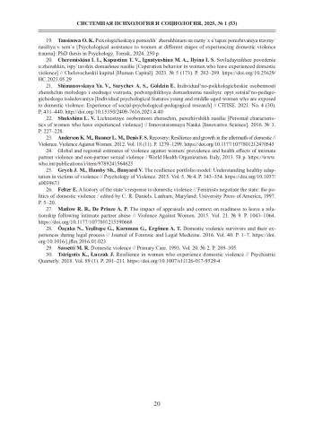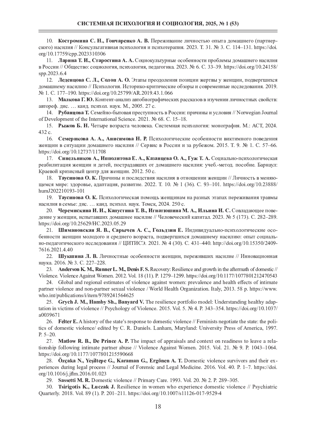 30. Tsirigotis K., Łuczak J. Resilience in women who experience domestic violence // Psychiatric Quarterly. 2018. Vol. 89 (1). P. 201-211. DOI: 10.1007/s11126-017-9529-4 EDN: YEPGQX