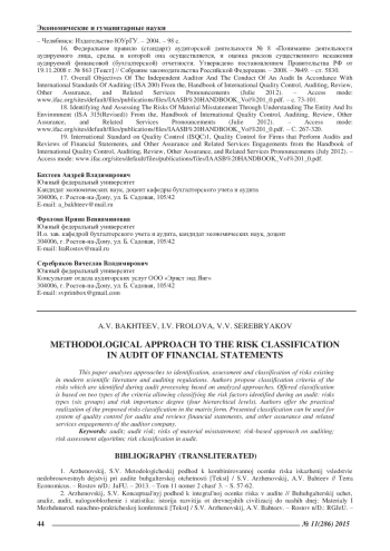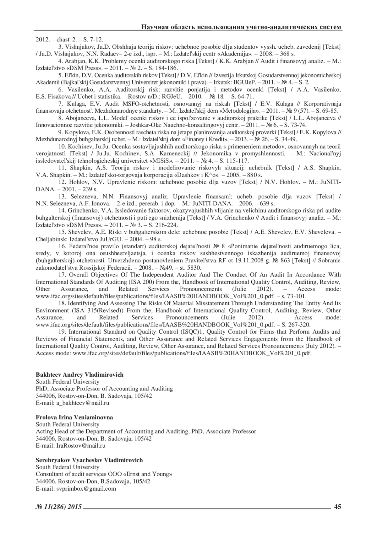 1. Арженовский, С.В. Методологический подход к комбинированной оценке риска искажений вследствие недобросовестных действий при аудите бухгалтерской отчетности [Текст] / С.В. Арженовский, А.В. Бахтеев // Terra Economicus. - Ростов н/Д.: ЮФУ. - 2013. - Том 11 номер 2 часть 3. - С. 57-62. EDN: RKUSIL
