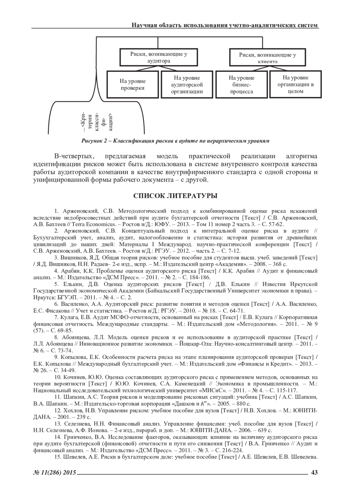 2. Арженовский, С.В. Концептуальный подход к интегральной оценке риска в аудите // Бухухгалтерский учет, анализ, аудит, налогообложение и статистикa: история развития от древнейших цивилизаций до наших дней: Материалы I Международ. научно-практической конференции [Текст] / С.В. Арженовский, А.В. Бахтеев. - Ростов н/Д.: РГЭУ. - 2012. - часть 2. - С. 7-12. EDN: QQSAWV