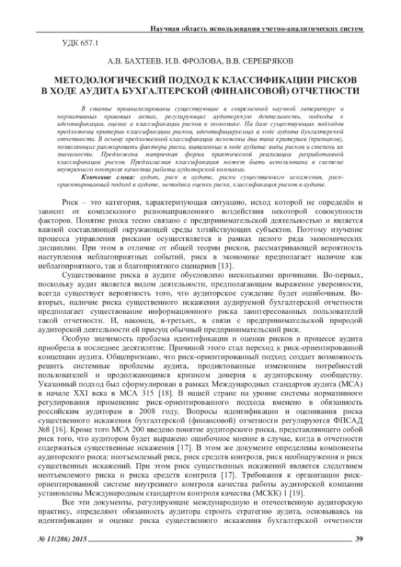 6. Василенко, А.А. Аудиторский риск: развитие понятия и методов оценки [Текст] / А.А. Василенко, Е.С. Фисакова // Учет и статистика. - Ростов н/Д.: РГЭУ. - 2010. - № 18. - С. 64-71. EDN: NDUOMR