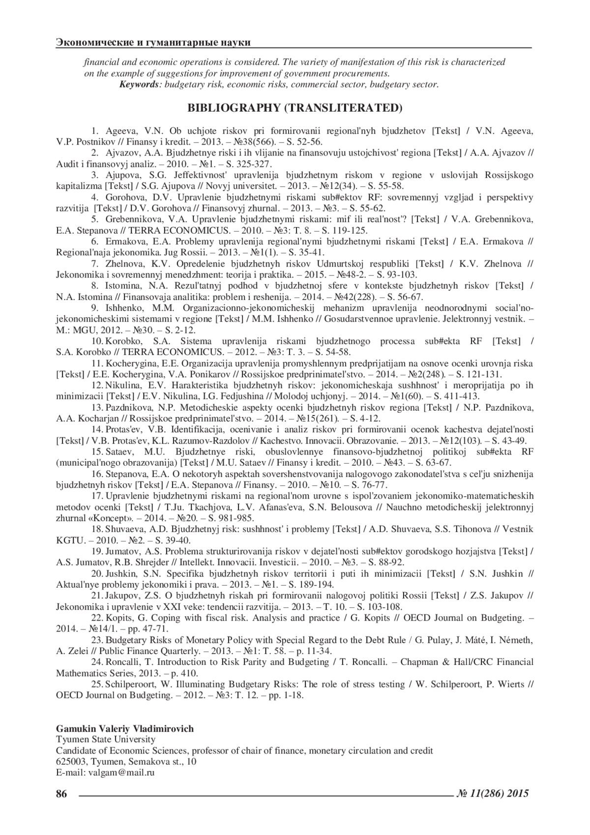 ГАМУКИН В. В. ХОЗЯЙСТВЕННЫЕ РИСКИ ПУБЛИЧНЫХ БЮДЖЕТОВ // ЭКОНОМИЧЕСКИЕ И ГУМАНИТАРНЫЕ НАУКИ. 2015. № 11 (286)