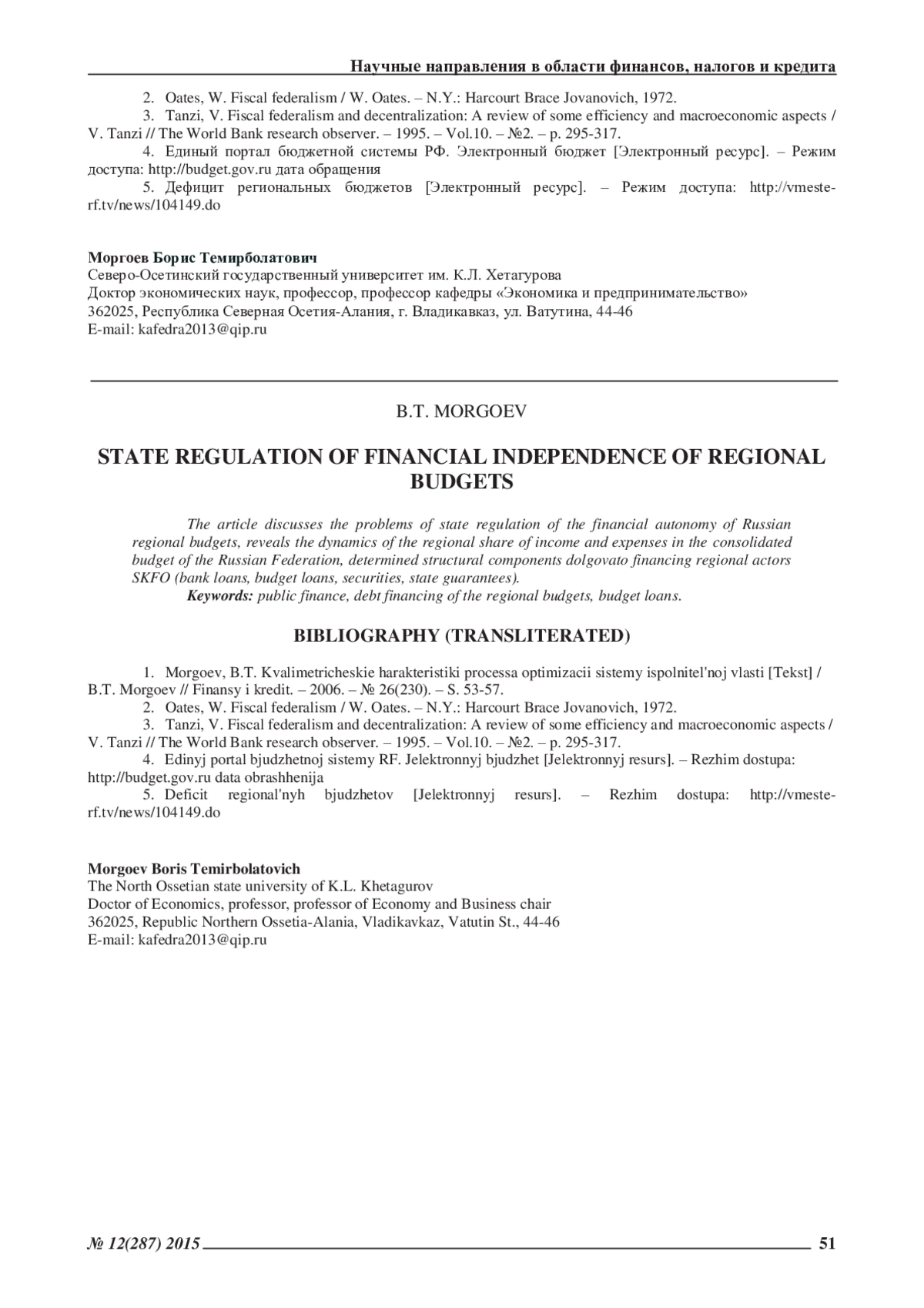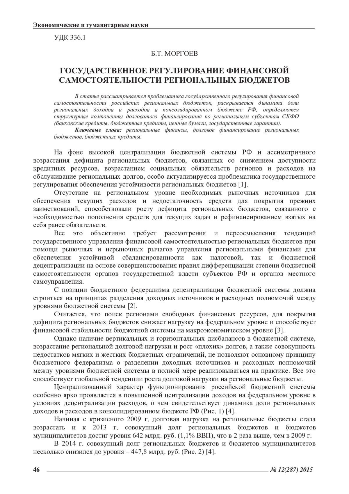 МОРГОЕВ Б. Т. ГОСУДАРСТВЕННОЕ РЕГУЛИРОВАНИЕ ФИНАНСОВОЙ САМОСТОЯТЕЛЬНОСТИ РЕГИОНАЛЬНЫХ БЮДЖЕТОВ // ЭКОНОМИЧЕСКИЕ И ГУМАНИТАРНЫЕ НАУКИ. 2015. № 12 (287)