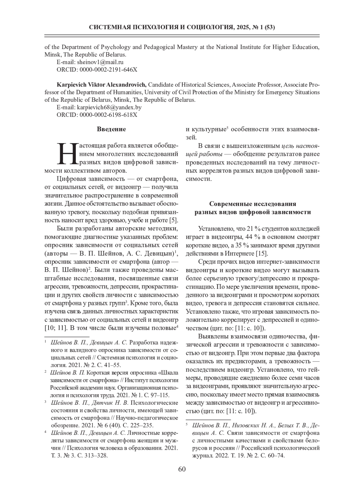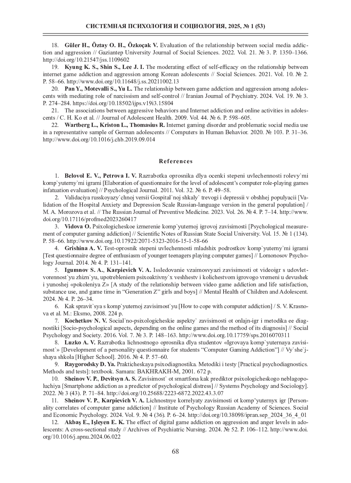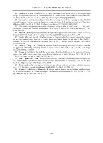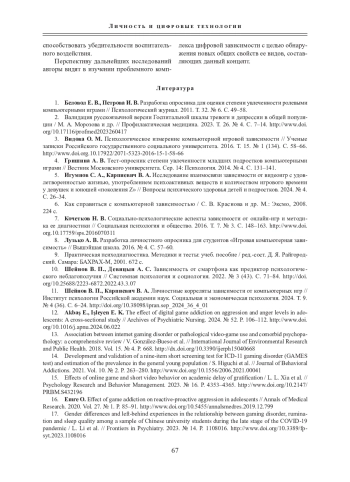 Цель статьи - обобщение результатов ранее проведенных исследований на тему личностных коррелятов цифровой зависимости. Основой исследования послужили результаты онлайн-тестирования 694 респондентов в возрасте от 10 до 69 лет. В исследовании использованы опросник APA для оценки зависимости от видеоигр, опросник зависимости от смартфона (автор - В. П. Шейнов), опросник зависимости от социальных сетей (авторы - В. П. Шейнов, А. С. Девицын), короткая версия опросника прокрастинации (авторы - В. П. Шейнов, А. С. Девицын), русскоязычная версия Госпитальной шкалы тревоги и депрессии / Hospital Anxiety and Depression Scale - HADS (адаптация М. А. Морозовой и др.), шкала агрессивности Х. Ю. Айзенка.