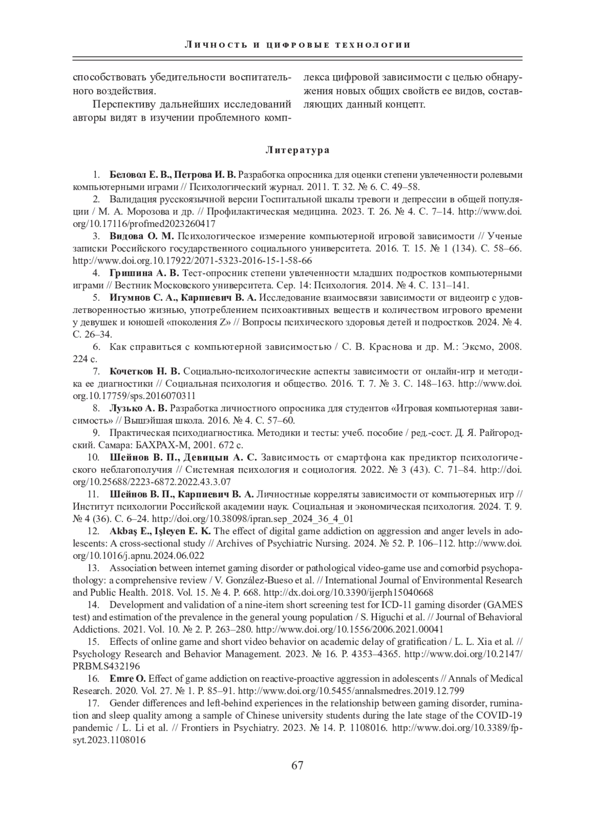 Теоретическое значение полученных результатов заключается в осознании того, что разные виды зависимости (от смартфона, социальных сетей и видеоигр) формируют триединую концепцию, которую можно определить как проблемный комплекс цифровой зависимости. Он включает в себя зависимость от смартфона, зависимость от социальных сетей и зависимость от видеоигр, которые взаимосвязаны между собой и с такими проблемными характеристиками, как тревожность, депрессия, агрессивность, прокрастинация, проблемы со сном и продолжительность ежедневного участия в видео- играх.