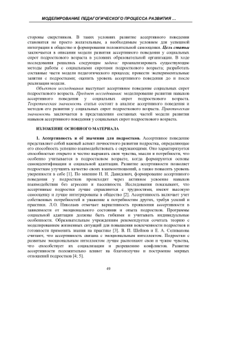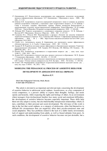Статья посвещена рассмотрению ключевых тем, связанных с ассертивностью социальных сирот подросткового возраста. Первый раздел включает введение в ассертивность, её влияние на самооценку и уверенность в себе. Второй раздел посвящен социальным сиротам, их уникальным потребностям и вызовам, формируемым жизненными обстоятельствами, что требует особого подхода со стороны педагогов и социальных работников. Третий раздел охватывает педагогические методы, направленные на развитие ассертивности, включая упражнения и ролевые игры, с акцентом на моделирование педагогического процесса и успешные примеры реализации. Также обсуждается оценка эффективности программ по развитию ассертивности для понимания успешных подходов. В заключение рассматриваются перспективы дальнейших исследований, что поможет выявить новые направления для работы с социальными сиротами подросткового возраста.