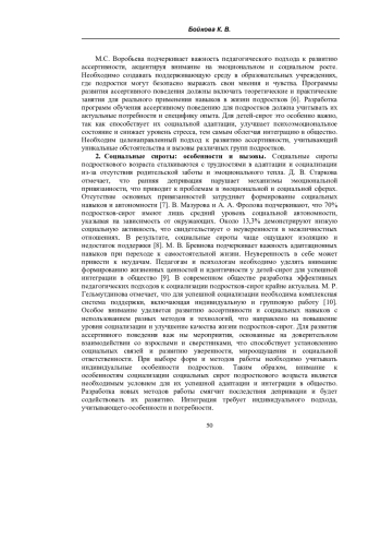 18. Бойкова К.В. Ассертивность педагогов учреждений интернатного типа и ее влияние на развитие навыков ассертивного поведения у социальных сирот подросткового возраста / К. В. Бойкова // Север и молодежь: здоровье, образование, карьера: сборник материалов Всероссийской (с международным участием) научно-практической конференции, Ханты-Мансийск, 19-20 ноября 2020 года. - Ханты-Мансийск: Югорский государственный университет, 2020. - С. 624-628. EDN: EKUJPD