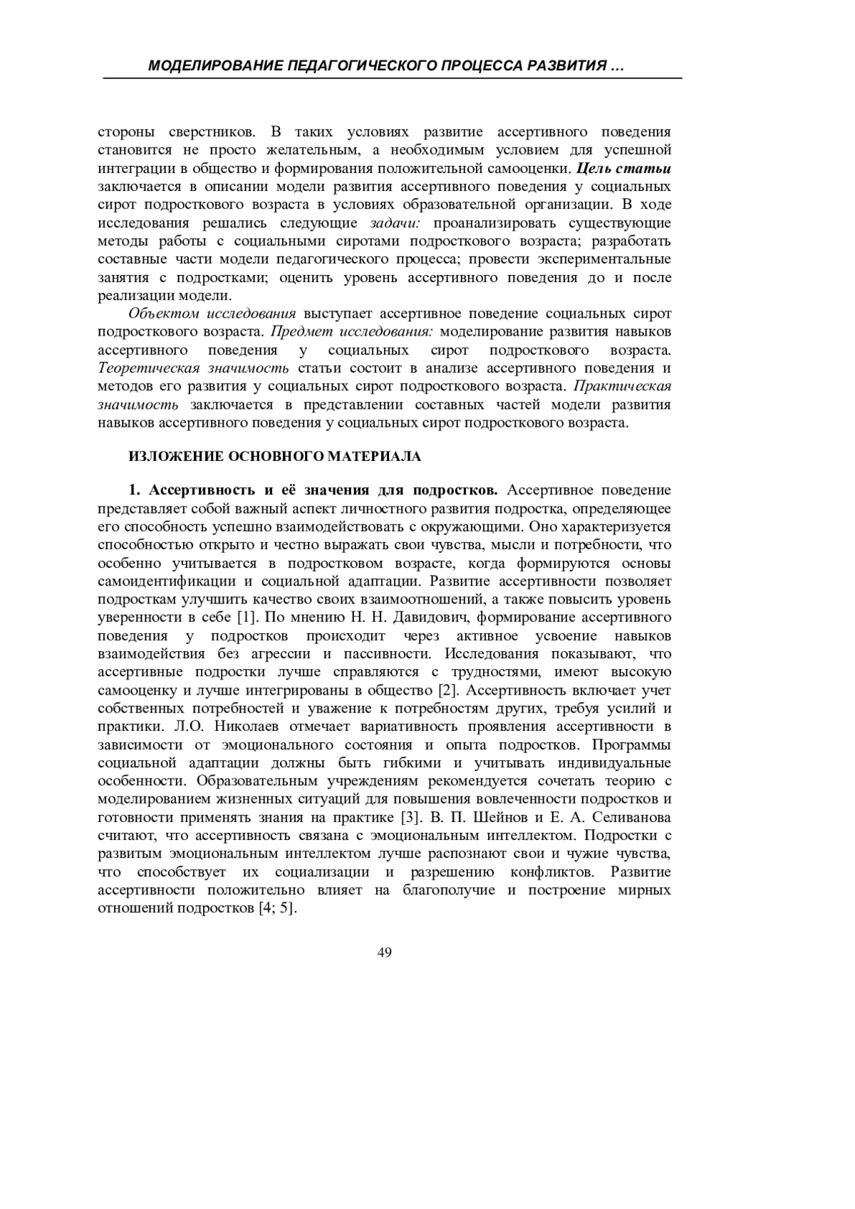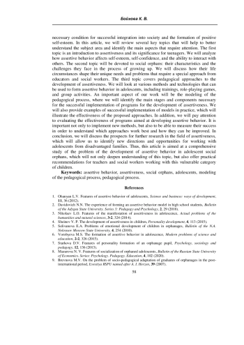 2. Давидович Н.Н. Опыт формирования ассертивной модели поведения у старшеклассников / Н.Н. Давыдович // Вестник Адыгейского государственного университета. Серия 3: Педагогика и психология. - 2018. - №2 (218). - С.29-36.