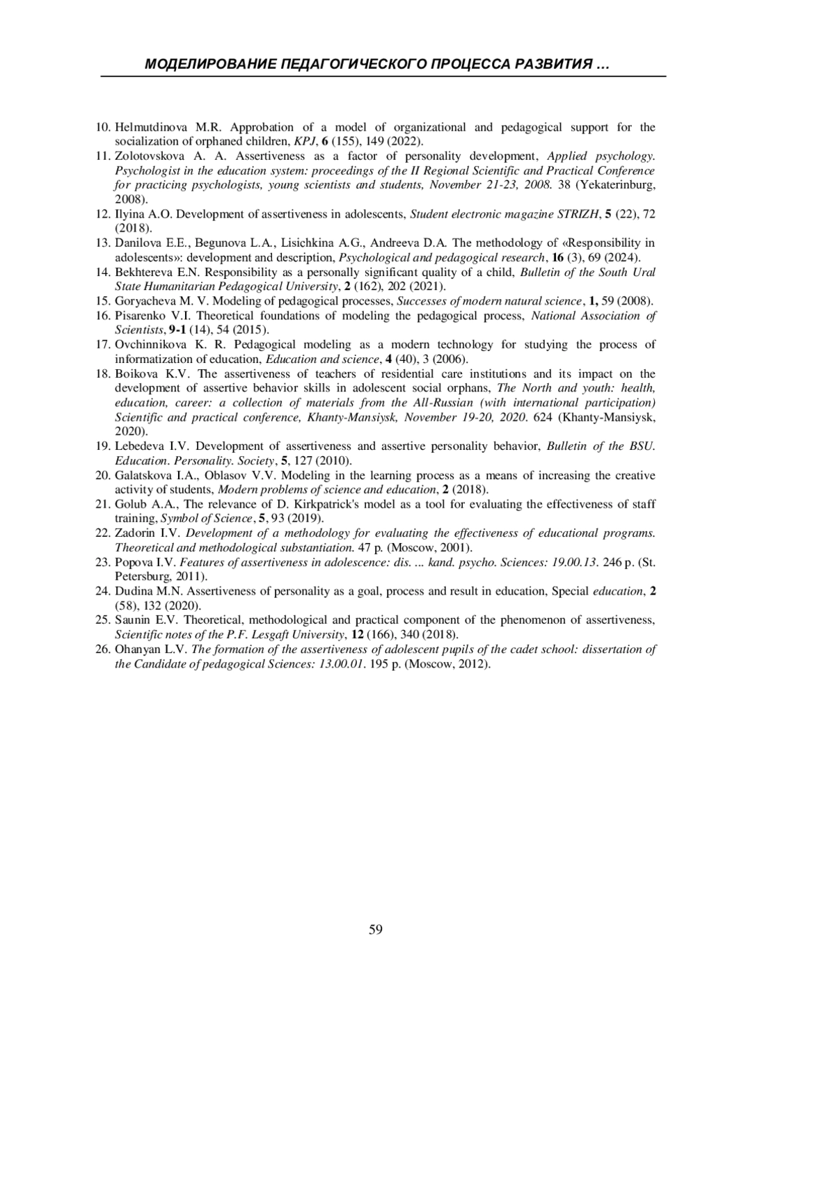 24. Дудина М.Н. Ассертивность личности как цель, процесс и результат в образовании / М. Н. Дудина // Специальное образование. - 2020. - № 2(58). - С. 132-149. EDN: TUSNMN