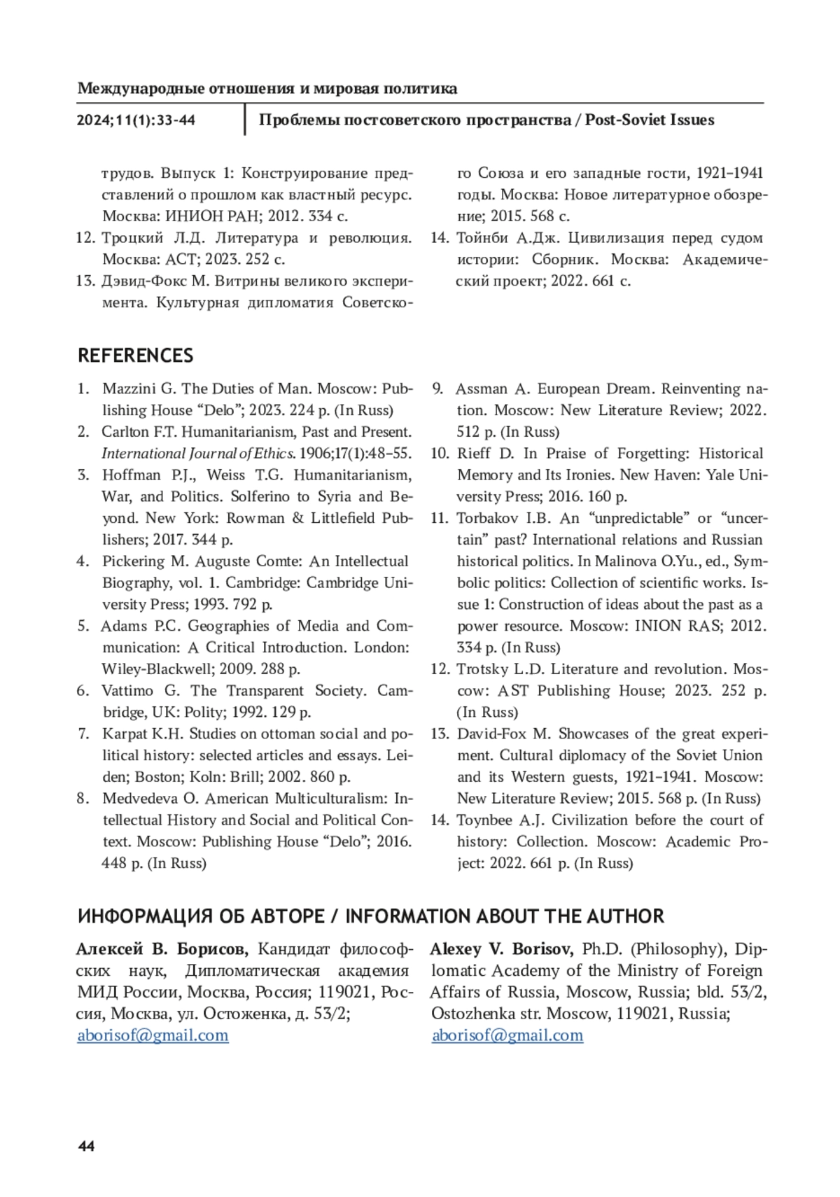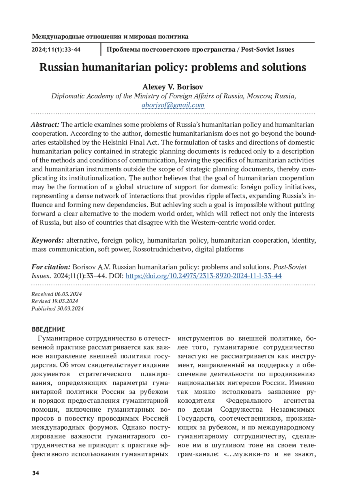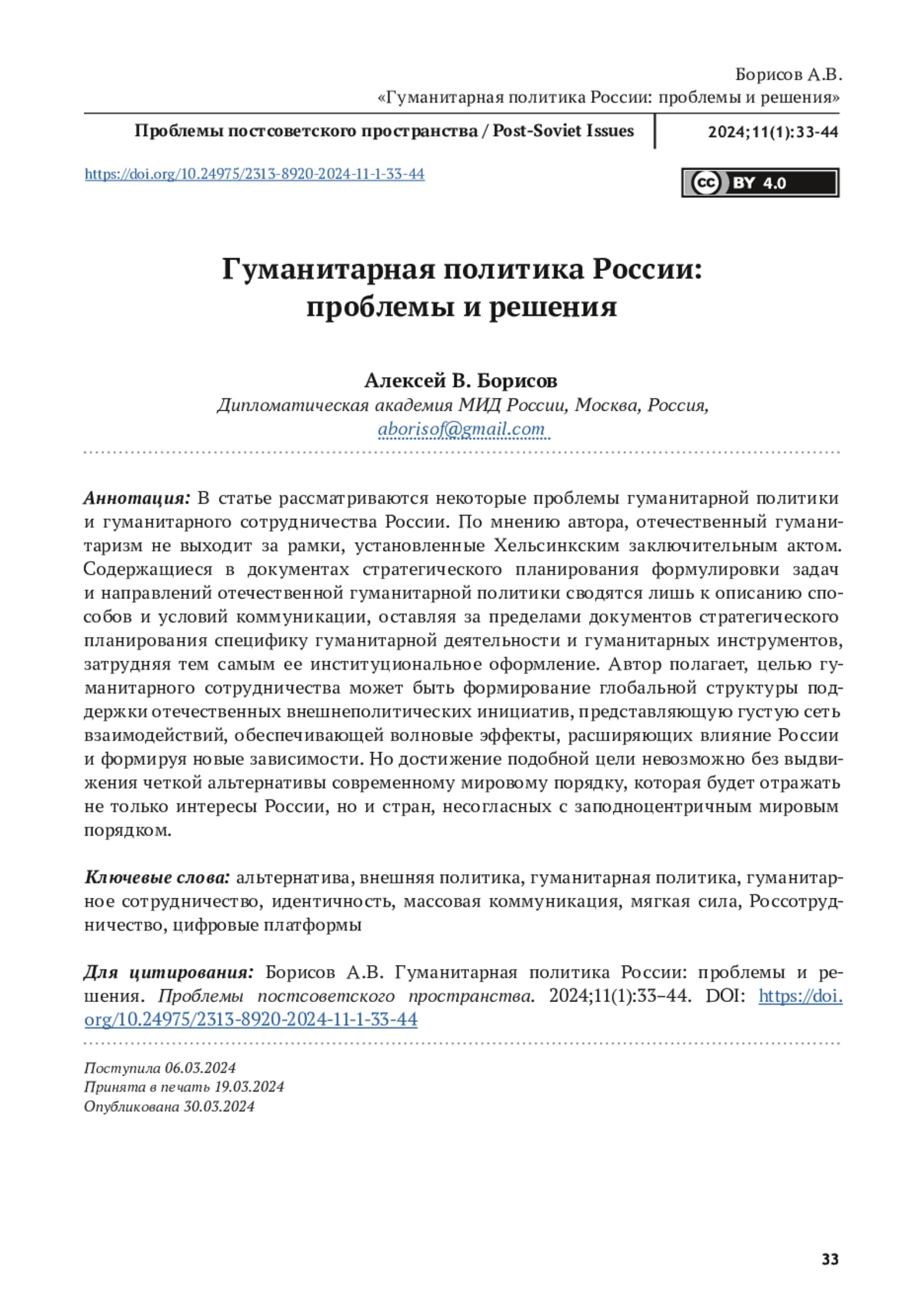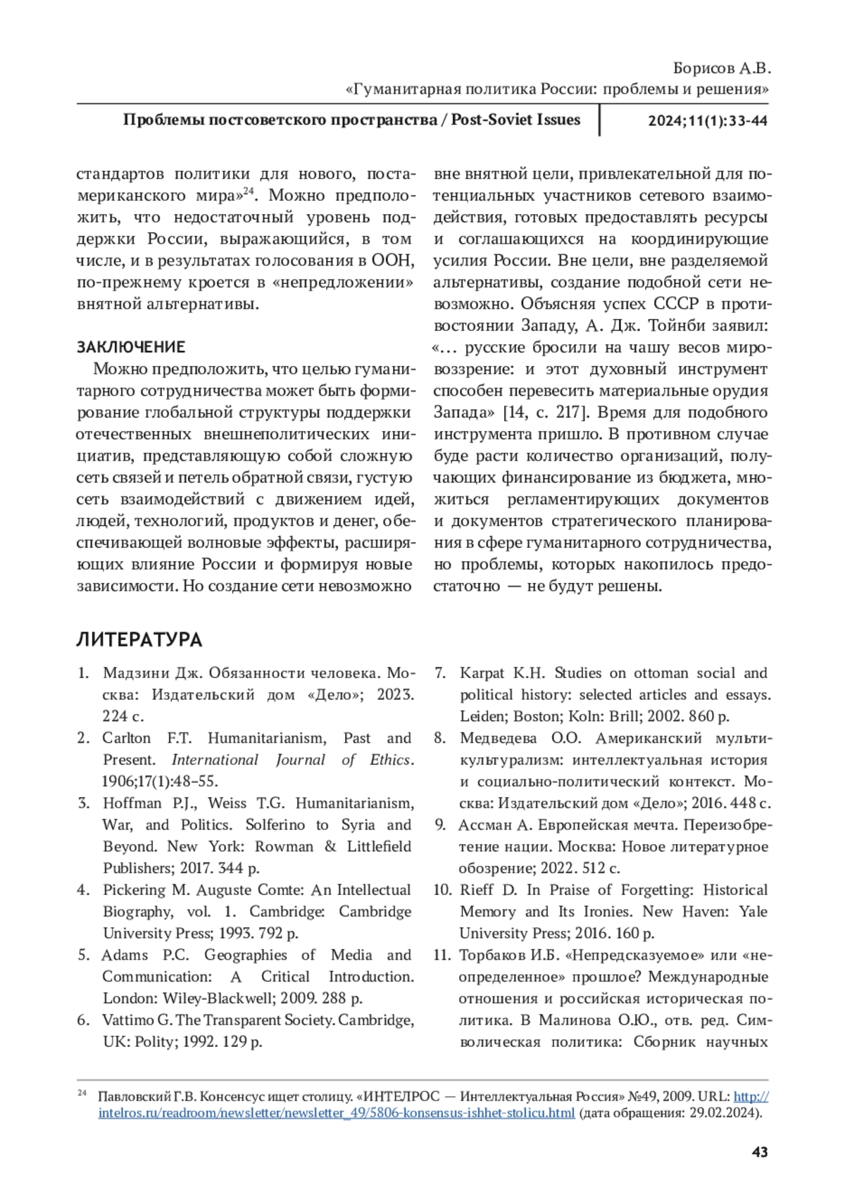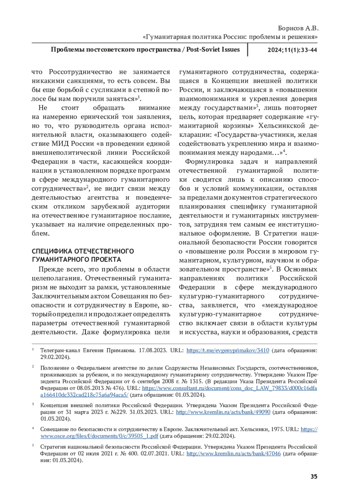 БОРИСОВ А. В. ГУМАНИТАРНАЯ ПОЛИТИКА РОССИИ: ПРОБЛЕМЫ И РЕШЕНИЯ // ПРОБЛЕМЫ ПОСТСОВЕТСКОГО ПРОСТРАНСТВА. 2025. ТОМ 11, № 1