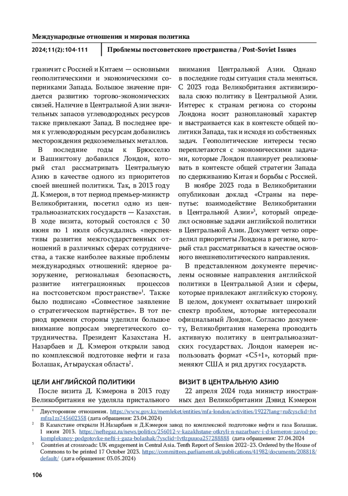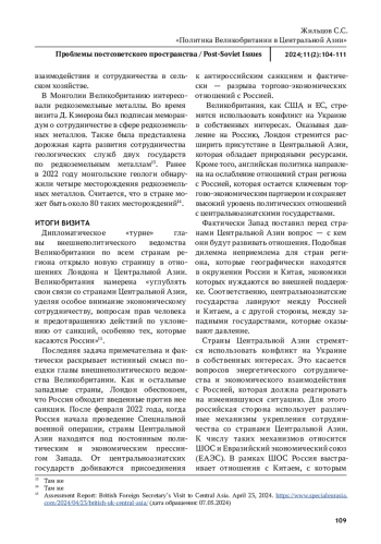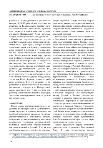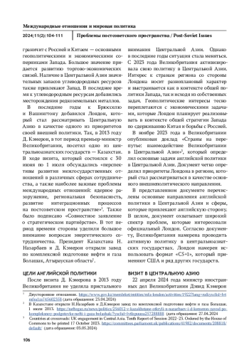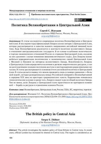 В статье исследуется современная политика Великобритании в Центральной Азии. В последние годы официальный Лондон усилил интерес к Центральной Азии, которая рассматривается в качестве важного направления английской внешней политики. Курс Великобритании реализуется в контексте политики коллективного Запада в отношении центральноазиатских государств. В ее основе ослабление политических и торгово-экономических отношений России со странами Центральной Азии, оказание на них давления с целью изменения внешнеполитического курса. Для Лондона важно добиться переориентации политических и экономических связей Центральной Азии с Москвой и Пекином на интересы коллективного Запада. Вовлеченность Лондона в Центральную Азию определяется наличием в регионе энергетических ресурсов, а также долгосрочными планами получения доступа к месторождениям редкоземельных металлов. В статье рассматриваются основные итоги английской политики в Центральной Азии. В статье делается вывод, что можно проводить лишь условные сравнения с «Большой игрой», которая разворачивалась между Российской империей и Великобританией в середине XIX века на просторах среднеазиатских ханств. Кардинально изменились геополитические условия и кроме того, Лондон следует в русле общей политики Запада. Тем не менее, цели Лондона в Центральной Азии практически не претерпели изменений — борьба за ресурсы и ограничение влияния России.