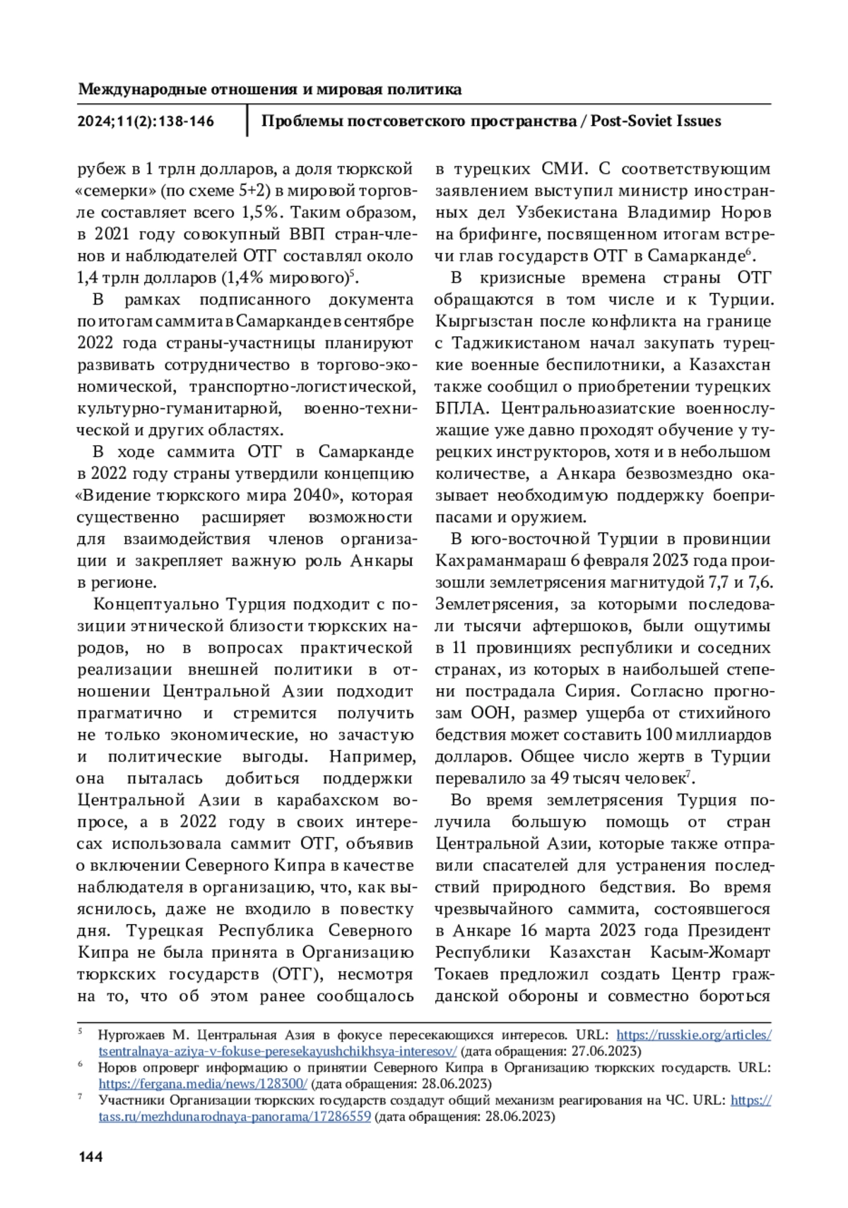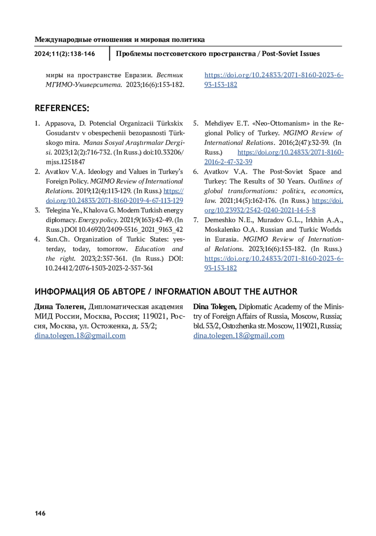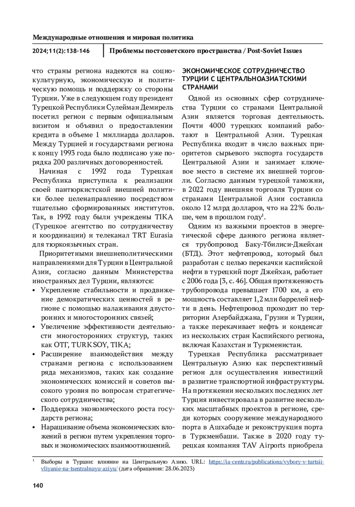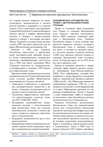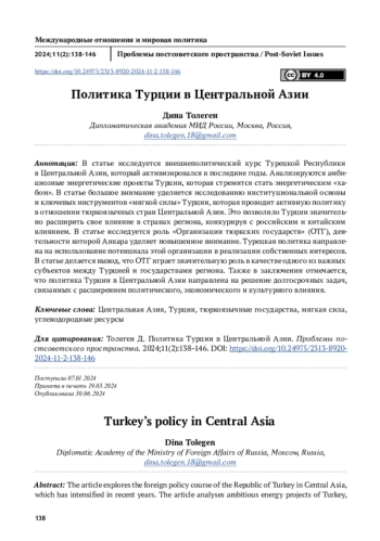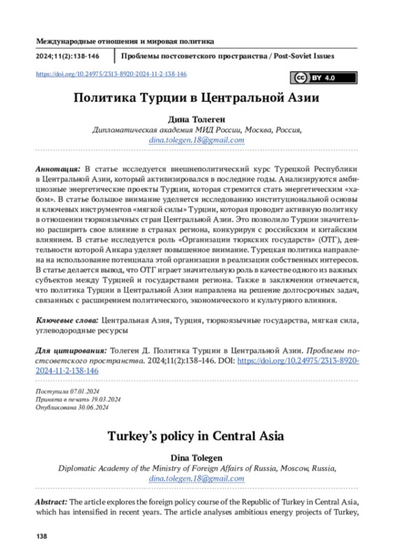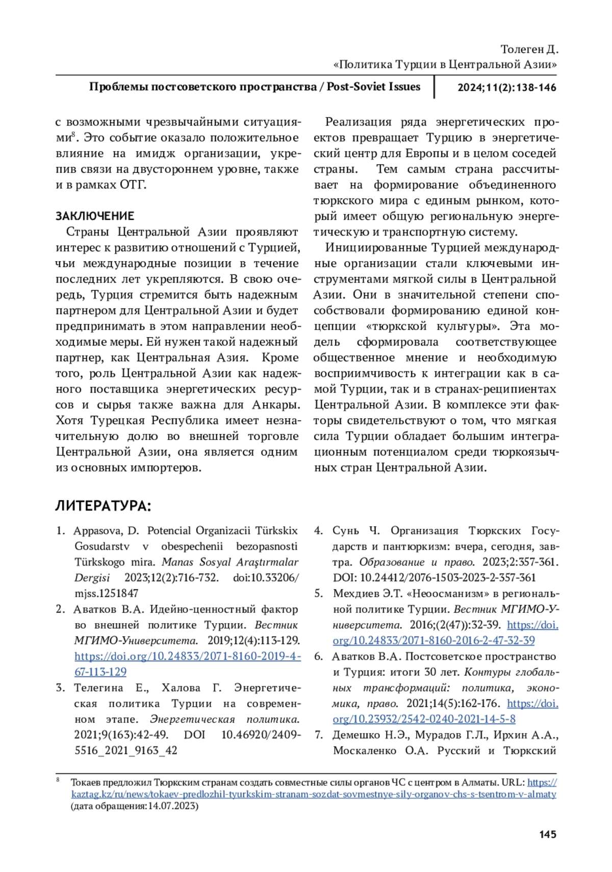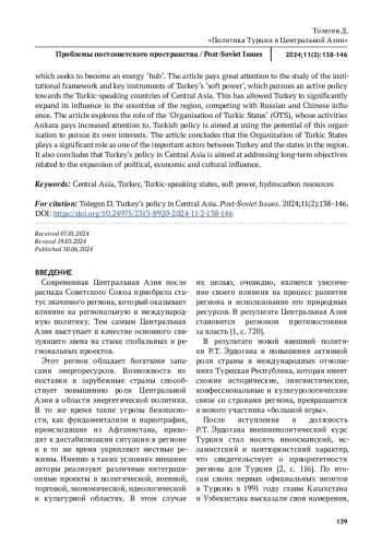 ТОЛЕГЕН Д. ПОЛИТИКА ТУРЦИИ В ЦЕНТРАЛЬНОЙ АЗИИ // ПРОБЛЕМЫ ПОСТСОВЕТСКОГО ПРОСТРАНСТВА. 2025. ТОМ 11, № 2