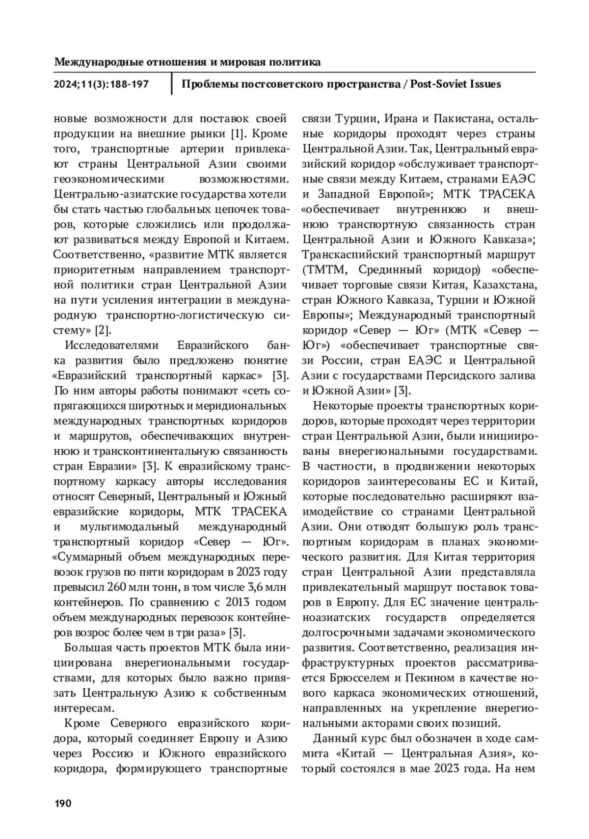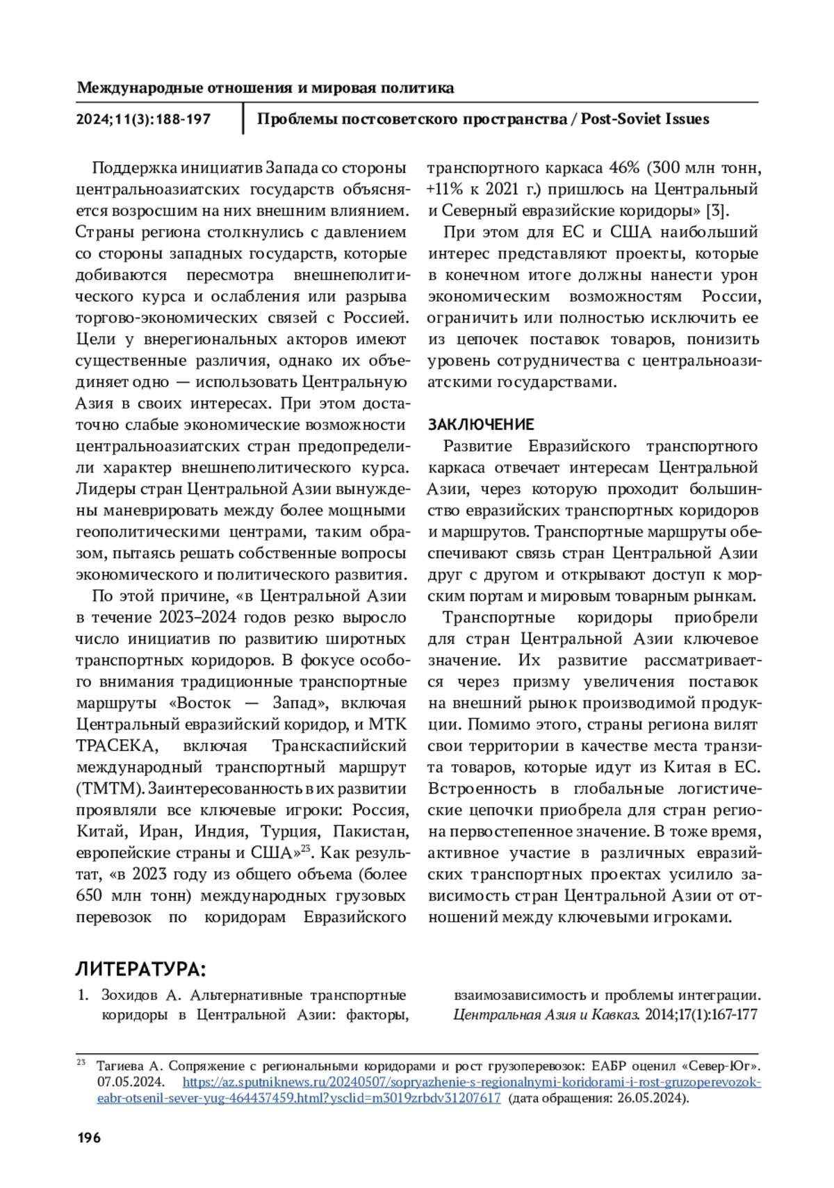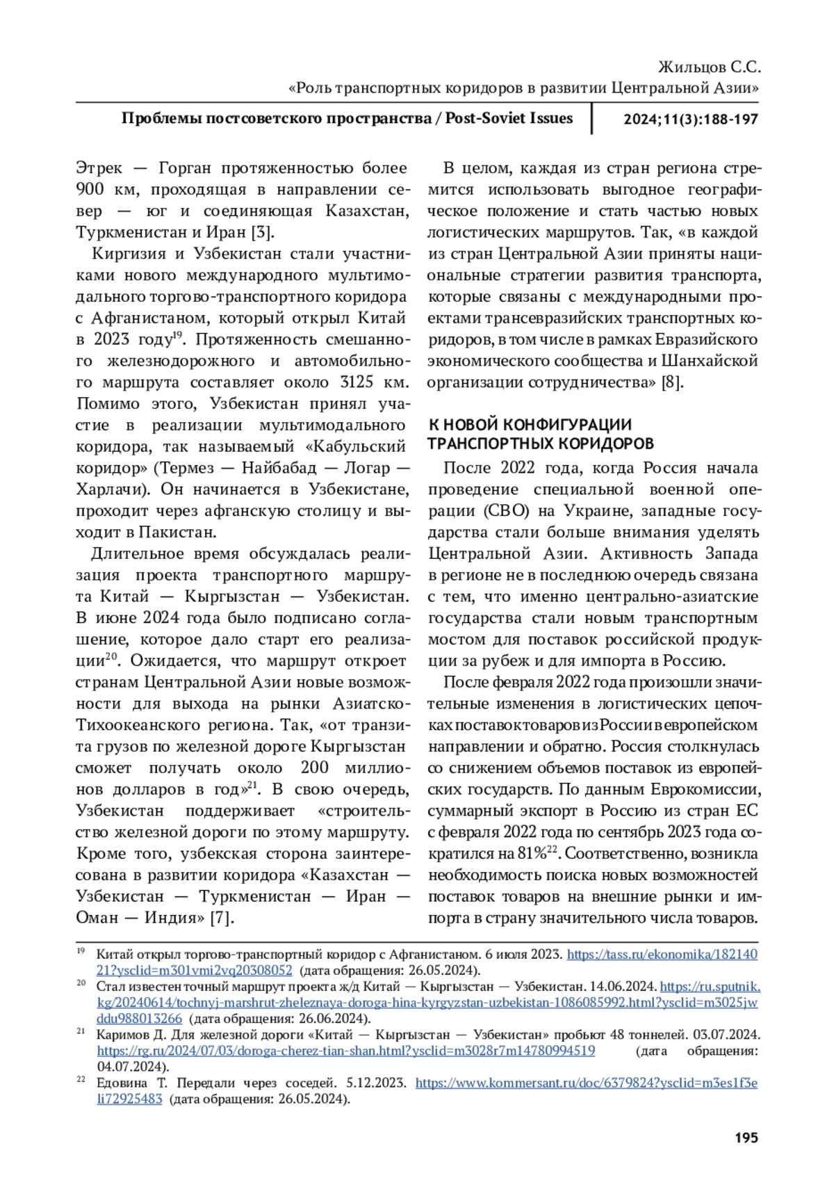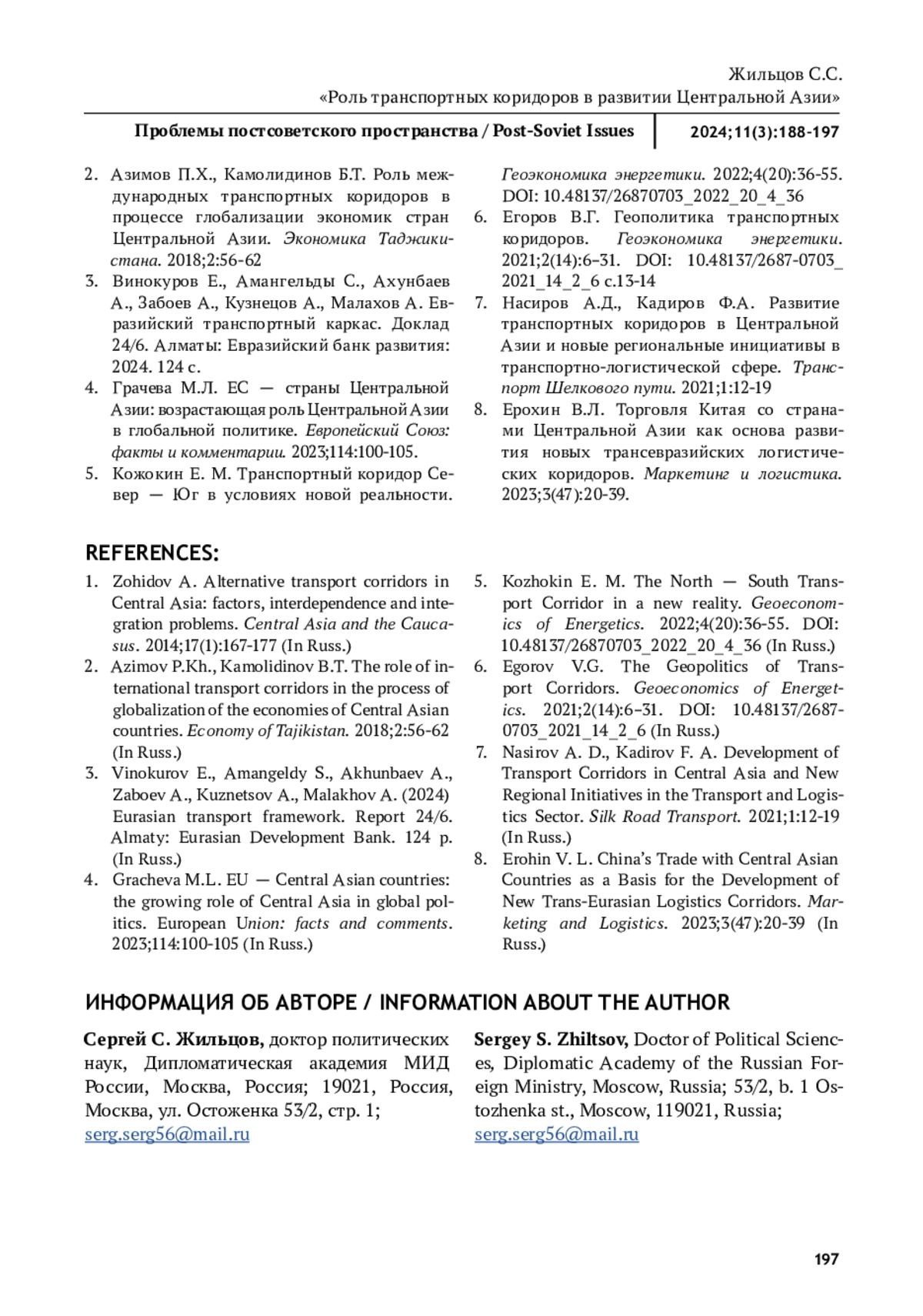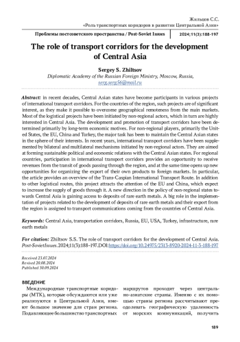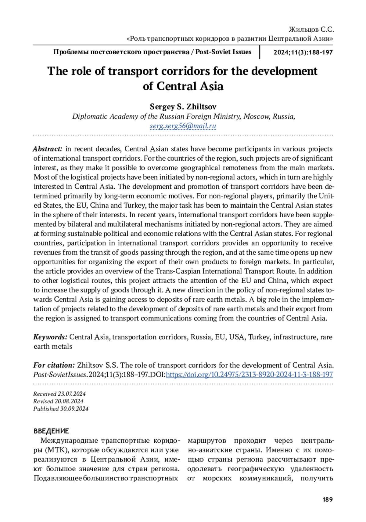 ЖИЛЬЦОВ С. С. РОЛЬ ТРАНСПОРТНЫХ КОРИДОРОВ В РАЗВИТИИ ЦЕНТРАЛЬНОЙ АЗИИ // ПРОБЛЕМЫ ПОСТСОВЕТСКОГО ПРОСТРАНСТВА. 2025. ТОМ 11, № 3