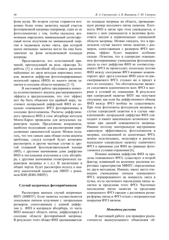 Проведенные расчеты методом МонтеКарло позволяют сделать следующие выводы. 1) При принятых значениях параметров задачи диффузия ФНЗ за пределы освещенного ФЧЭ может увеличить величину порогового детектируемого потока при освещении МФПУ пятном на 30–40 % по сравнению со случаем равномерной засветки фотоприемника (кривые 1–3 на рис. 1). 2) Нормированная на мощность излучения в пучке или (что то же самое) на полное количество частиц, сгенерированных в слое абсорбера, величина фотосигнала засвеченного ФЧЭ быстро спадает с увеличением размера пятна засветки в диапазоне 10–40 мкм. Это связано с уменьшением доли пучка света в центральном пикселе (кривые 1–3 на рис. 1). При этом для гауссова пятна с размером 30 мкм найденный пороговый поток оказывается увеличенным примерно в 3 раза по сравнению со случаем равномерной засветки матрицы. Этот результат показывает, что критически важным фактором для методики определения пороговых характеристик МФПУ с применением «пиксельной» засветки является точность покрытия пятном ФЧЭ матрицы. Этот же фактор играет важную роль как определяющий различие величин пороговых потоков и для ВЗНЛФПУ. 3) В целом, проведенное рассмотрение дает общий пример анализа, позволяющего для конкретных значений параметров посредством моделирования методом Монте-Карло предсказать величины пороговых характеристик многоэлементных ФПУ, определенных с использованием локальной («пиксельной») засветки фотоприёмника и его однородной засветки.