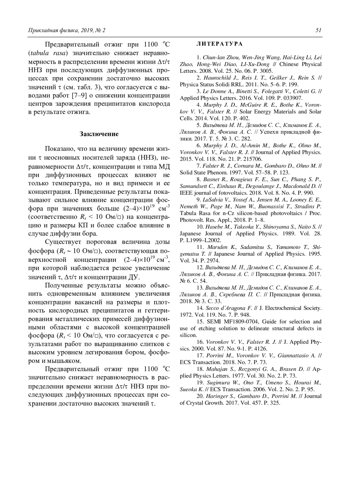16. Voronkov V. V., Falster R. J. // J. Applied Phy-sics. 2000. Vol. 87. No. 9-1. P. 4126.