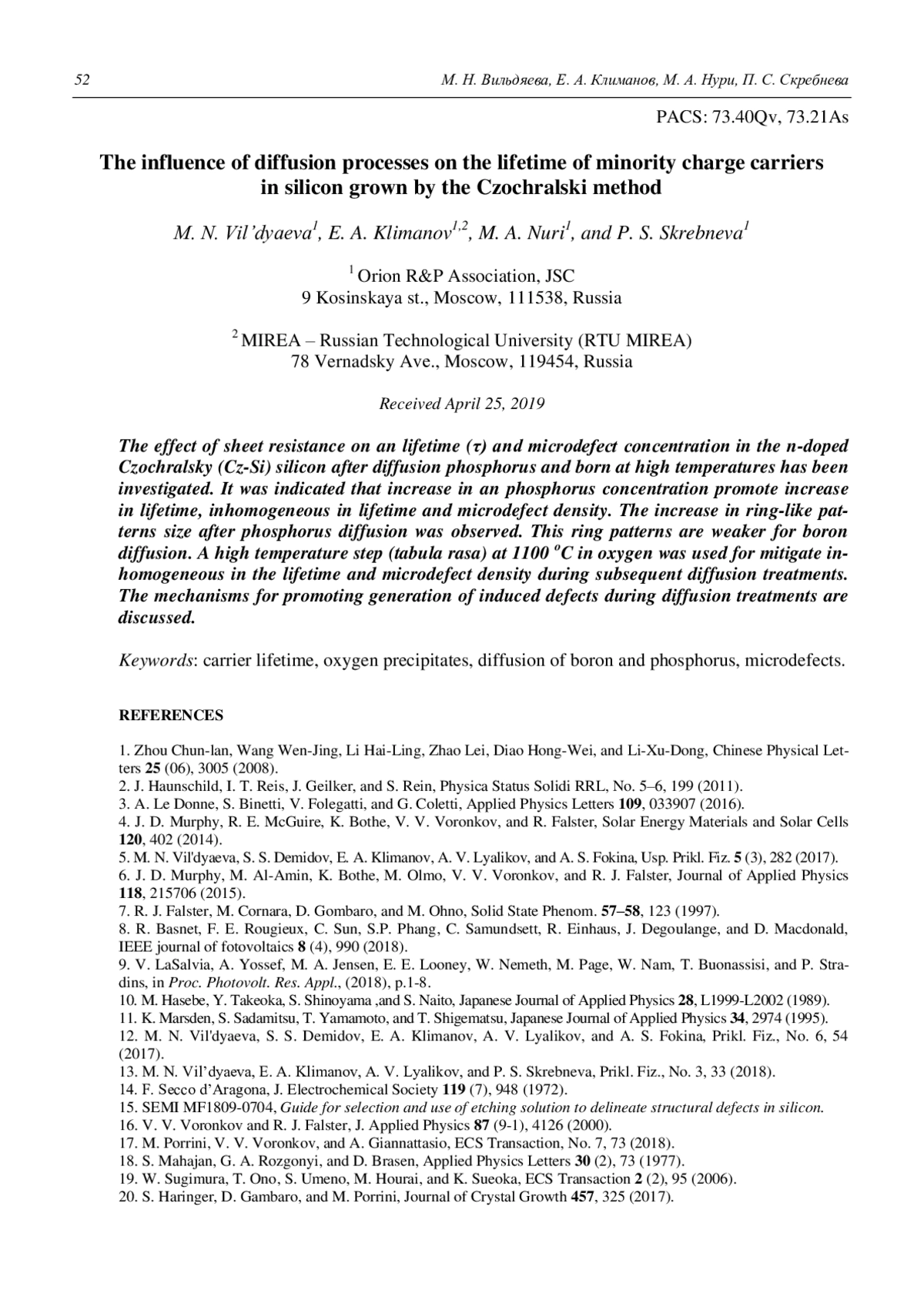 M. N. Vil’dyaeva, E. A. Klimanov, M. A. Nuri, and P. S. Skrebneva The influence of diffusion processes on the lifetime of minority charge carriers in silicon grown by the Czochralski method 46