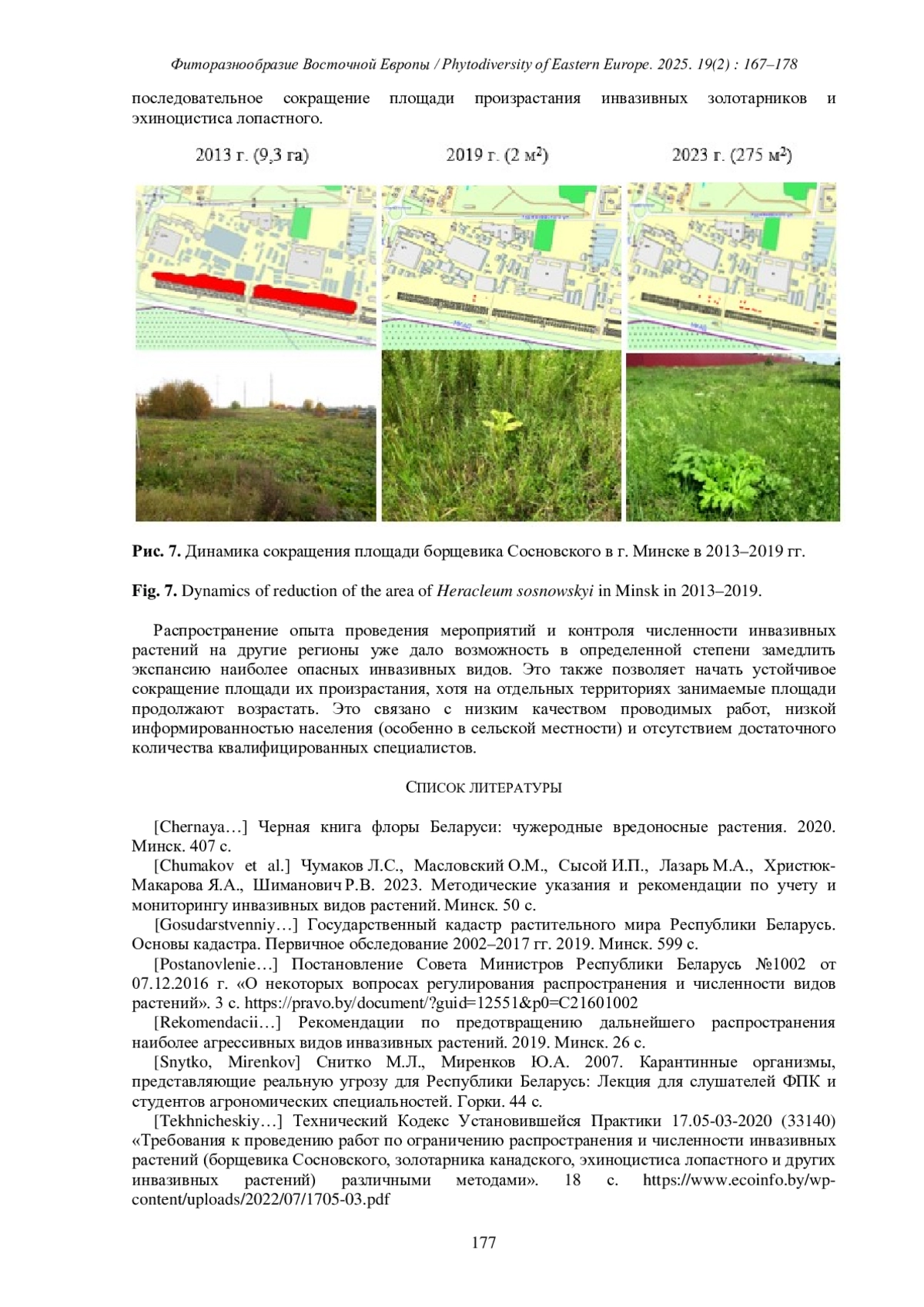 МАСЛОВСКИЙ О.М., ЧУМАКОВ Л.С., СЫСОЙ И.П., ЛАПИЦКИЙ В.М., ХРИСТЮК-МАКАРОВА Я.А. ЭКСПАНСИЯ НАИБОЛЕЕ ОПАСНЫХ ИНВАЗИВНЫХ ВИДОВ РАСТЕНИЙ В БЕЛАРУСИ: ИНВЕНТАРИЗАЦИЯ, ДИНАМИКА, ПРОГНОЗ РАЗВИТИЯ И ОЦЕНКА ЭФФЕКТИВНОСТИ МЕРОПРИЯТИЙ // ФИТОРАЗНООБРАЗИЕ ВОСТОЧНОЙ ЕВРОПЫ. 2025. Т. 19 № 2