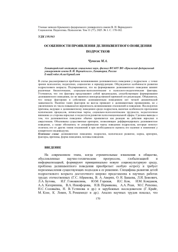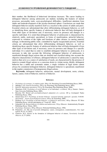 В статье рассматривается проблема возникновения делинквентного поведения у подростков с точки зрения психологии, педагогики, социологии и юриспруденции. Обсуждаются особенности развития подросткового возраста. Подчеркивается, что на формирование делинквентного поведения влияют различные биологические, социально-психологические и психолого-педагогические факторы. Уточняется, что эти факторы представляют собой предпосылки, способствующие формированию делинквентного поведения, но не являются непосредственной причиной его реализации. Объясняется, что между факторами и собственно делинквентным поведением нет четкой динамической зависимости. Наличие таких факторов не всегда приводит к делинквентным проявлениям, но с увеличением их числа повышается вероятность возникновения отклонений в поведении. Исследуются причины, ведущие к делинквентному поведению среди подростков, включая особенности протекания психических процессов, личностные черты, социально-психологические трудности, недостаточное внимание со стороны взрослых и недостаток развития психоэмоциональной сферы. Сделаны выводы о том, что делинквентное поведение обычно проявляется как реакция на действия взрослых и сверстников. Обоснованы существенные критерии, позволяющие дифференцировать делинквентное поведение, а также обозначить те специфические черты поведения подростков, которые помогут отличать его от других типов отклонений и при необходимости оценить его наличие и изменения у конкретного индивидуума.