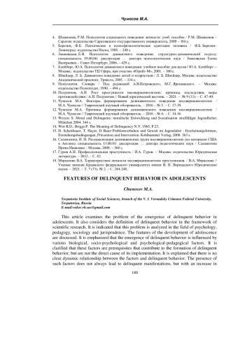 12. Чуносов М.А. Причины формирования делинквентного поведения несовершеннолетних / М.А. Чуносов // Таврический научный обозреватель. - 2016 - № 6. - С. 14-16. EDN: WCKMKN
