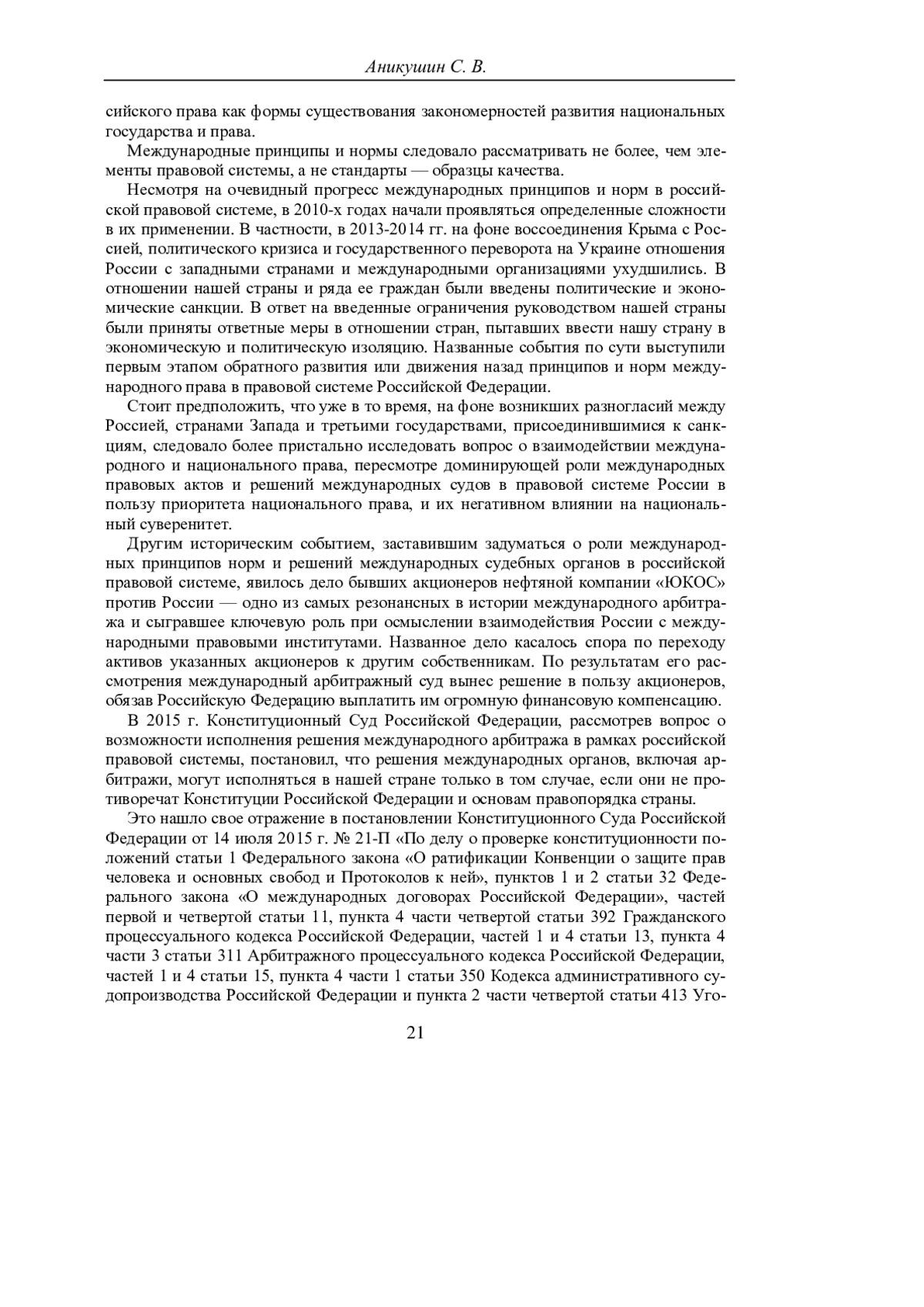 5. Постановление КС РФ от 14 июля 2015 г. № 21-П “По делу о проверке конституционности положений ст.1 ФЗ “О ратификации Конвенции о защите прав человека и основных свобод и Протоколов к ней”, п.1 и 2 ст. 32 ФЗ “О международных договорах РФ”, ч.ч. 1 и 4 ст. 11, п. 4 ч. 4 ст. 392 ГПК РФ, ч.ч. 1 и 4 ст. 13, п. 4 ч. 3 ст. 311 АПК РФ, ч.ч. 1 и 4 ст. 15, п. 4 ч. 1 ст. 350 КАС РФ и п. 2 ч. 4 ст. 413 УПК РФ в связи с запросом группы депутатов ГД” // СЗ РФ. - 2015. - № 30. - Ст. 4658.