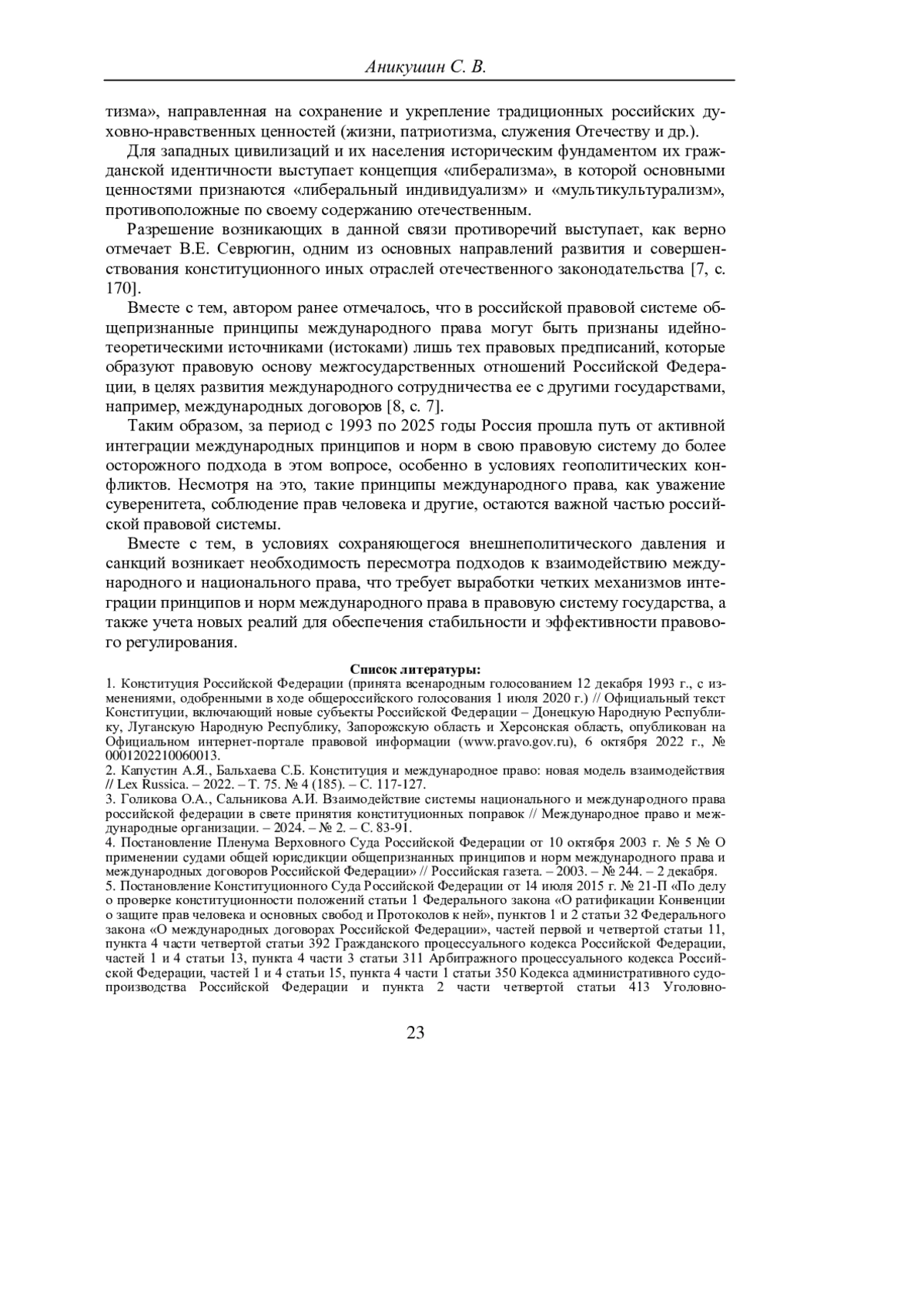 3. Голикова О.А., Сальникова А.И. Взаимодействие системы национального и международного права российской федерации в свете принятия конституционных поправок // Международное право и международные организации. - 2024. - № 2. - С. 83-91. EDN: BDXYBD