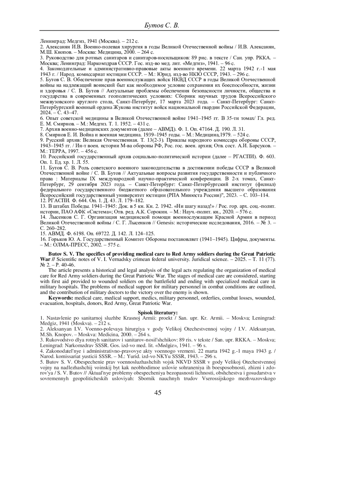 11. Бутов С. В. Роль советского военного законодательства в достижении победы СССР в Великой Отечественной войне / С. В. Бутов // Актуальные вопросы развития государственности и публичного права: Материалы IX междунар. науч.-практ. конференции. В 2-х томах, С-Пб, 29.09.2023 года. - С-Пб: Санкт-Петербургский институт (филиал)ФГБОУ ВО Всероссийский государственный университет юстиции (РПА Минюста России)“, 2023. - С. 103-114. EDN: PLOYHC