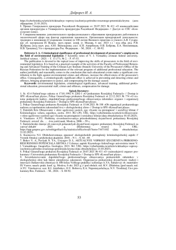 9. Совершенствование дополнительного профессионального образования прокурорских работников в экологической сфере как фактор укрепления законности. Организация прокурорской деятельности: традиции и инновации (Сухаревские чтения): сб. материалов IX Всерос. науч.-практ. конф. (г. Москва, 6 окт. 2023 г.); Ун-т прокуратуры Рос. Федерации. - М., 2024. - С. 88-92.