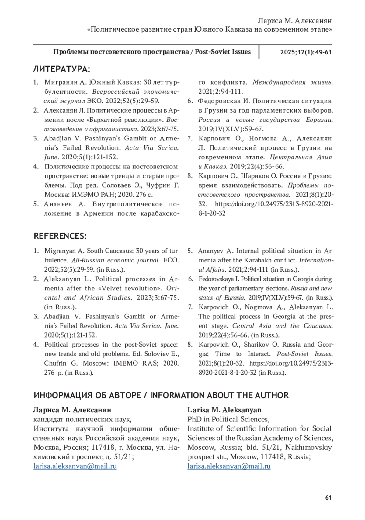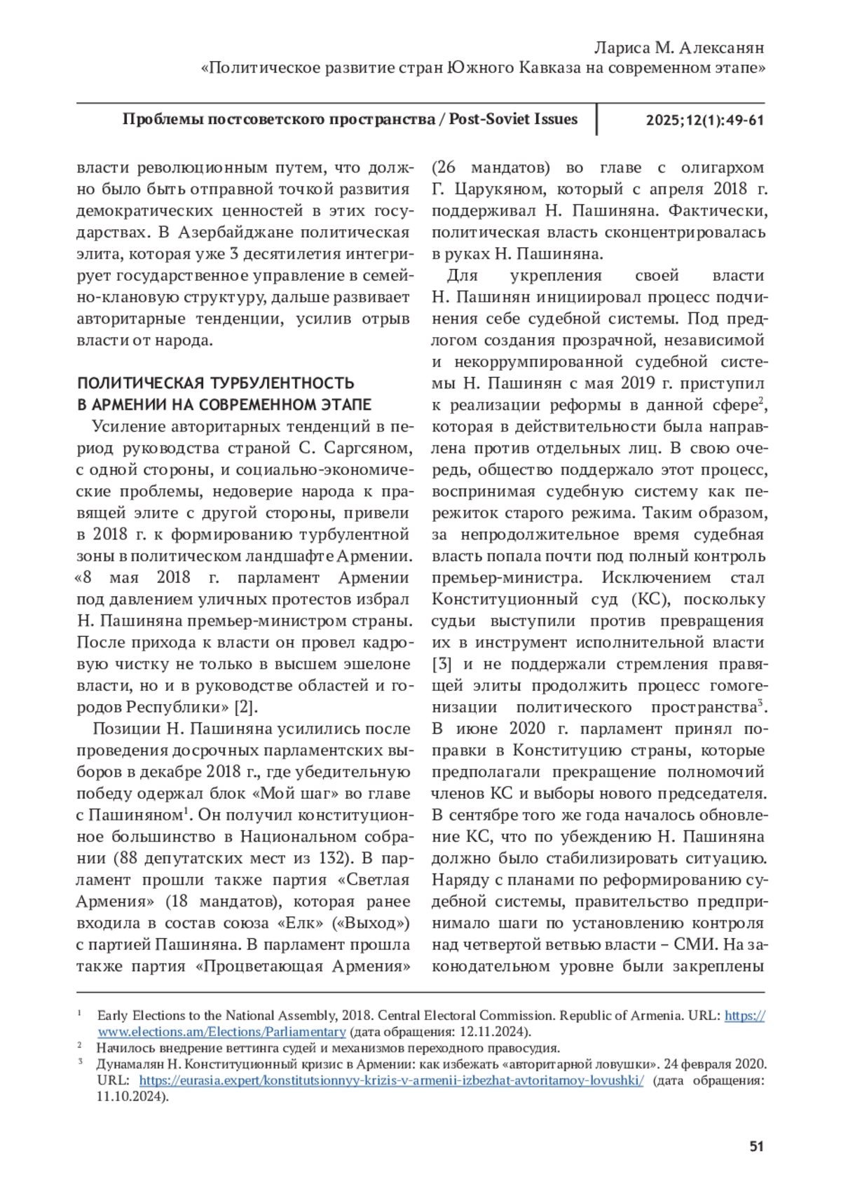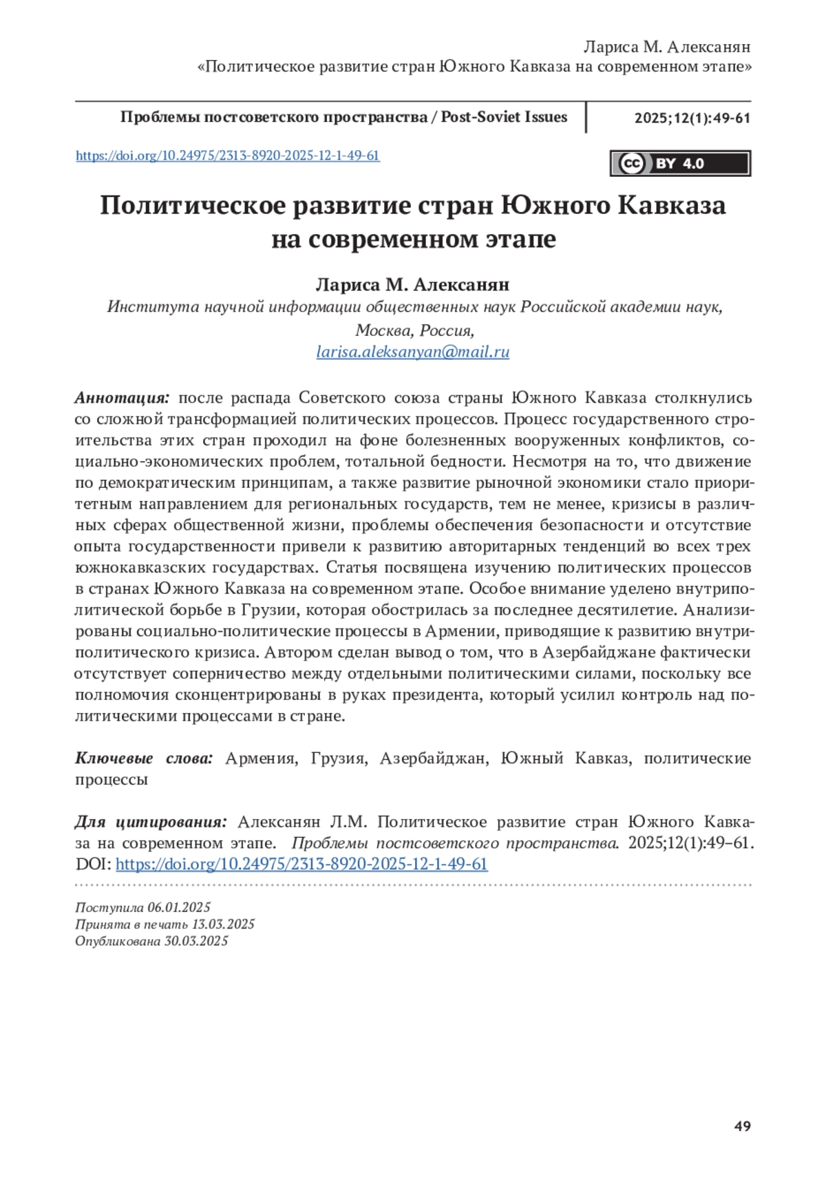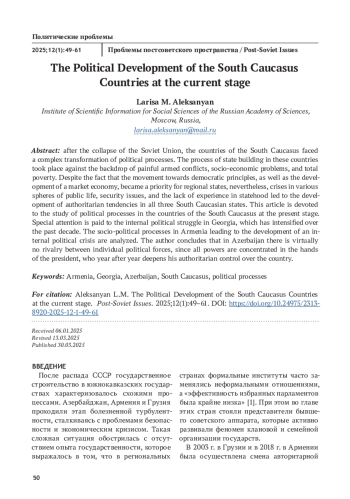 После распада Советского союза страны Южного Кавказа столкнулись со сложной трансформацией политических процессов. Процесс государственного строительства этих стран проходил на фоне болезненных вооруженных конфликтов, социально-экономических проблем, тотальной бедности. Несмотря на то, что движение по демократическим принципам, а также развитие рыночной экономики стало приоритетным направлением для региональных государств, тем не менее, кризисы в различных сферах общественной жизни, проблемы обеспечения безопасности и отсутствие опыта государственности привели к развитию авторитарных тенденций во всех трех южнокавказских государствах. Cтатья посвящена изучению политических процессов в странах Южного Кавказа на современном этапе. Особое внимание уделено внутриполитической борьбе в Грузии, которая обострилась за последнее десятилетие. Анализированы социально-политические процессы в Армении, приводящие к развитию внутриполитического кризиса. Автором сделан вывод о том, что в Азербайджане фактически отсутствует соперничество между отдельными политическими силами, поскольку все полномочия сконцентрированы в руках президента, который усилил контроль над политическими процессами в стране.