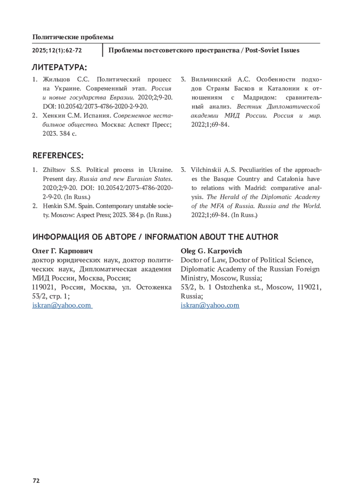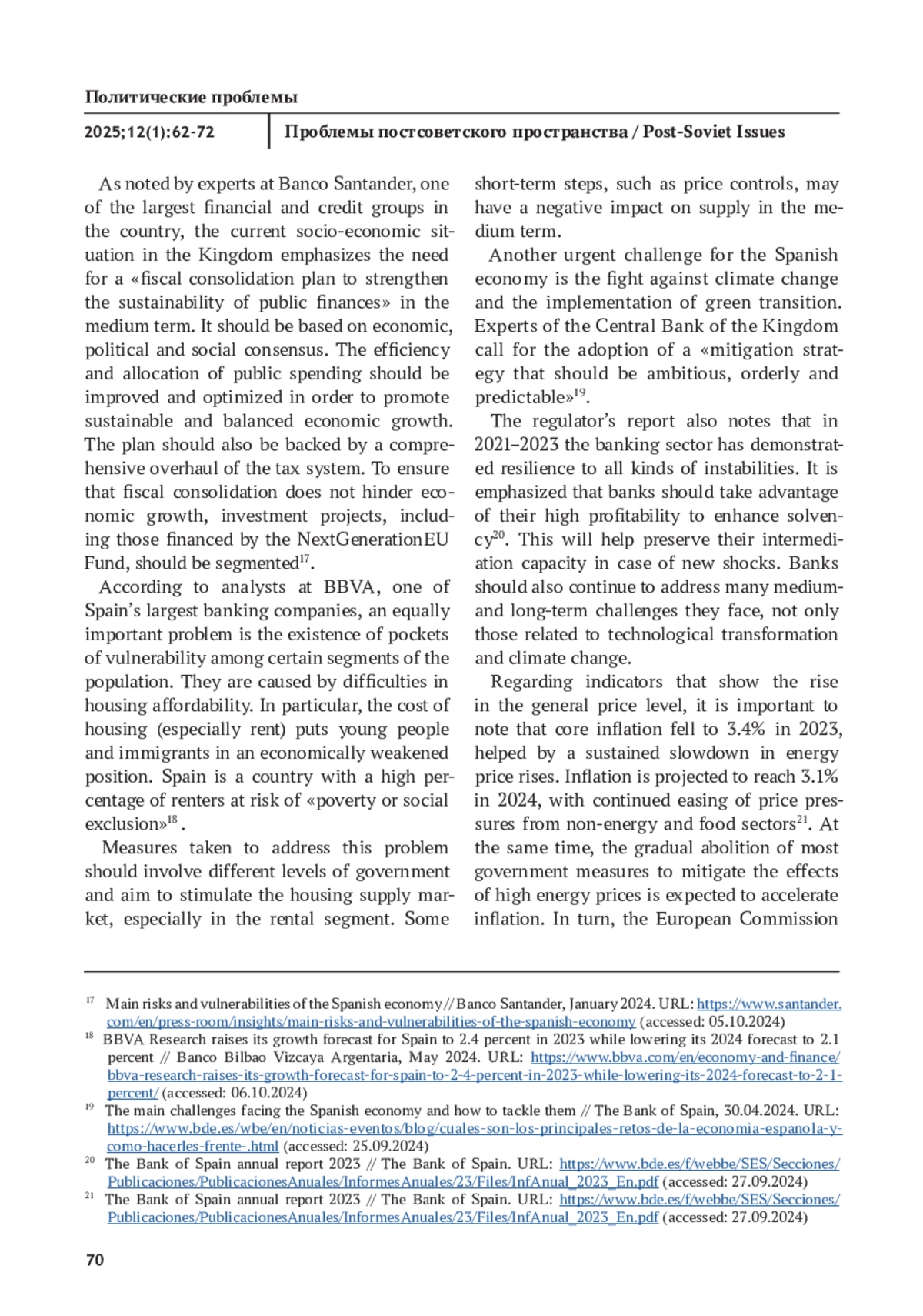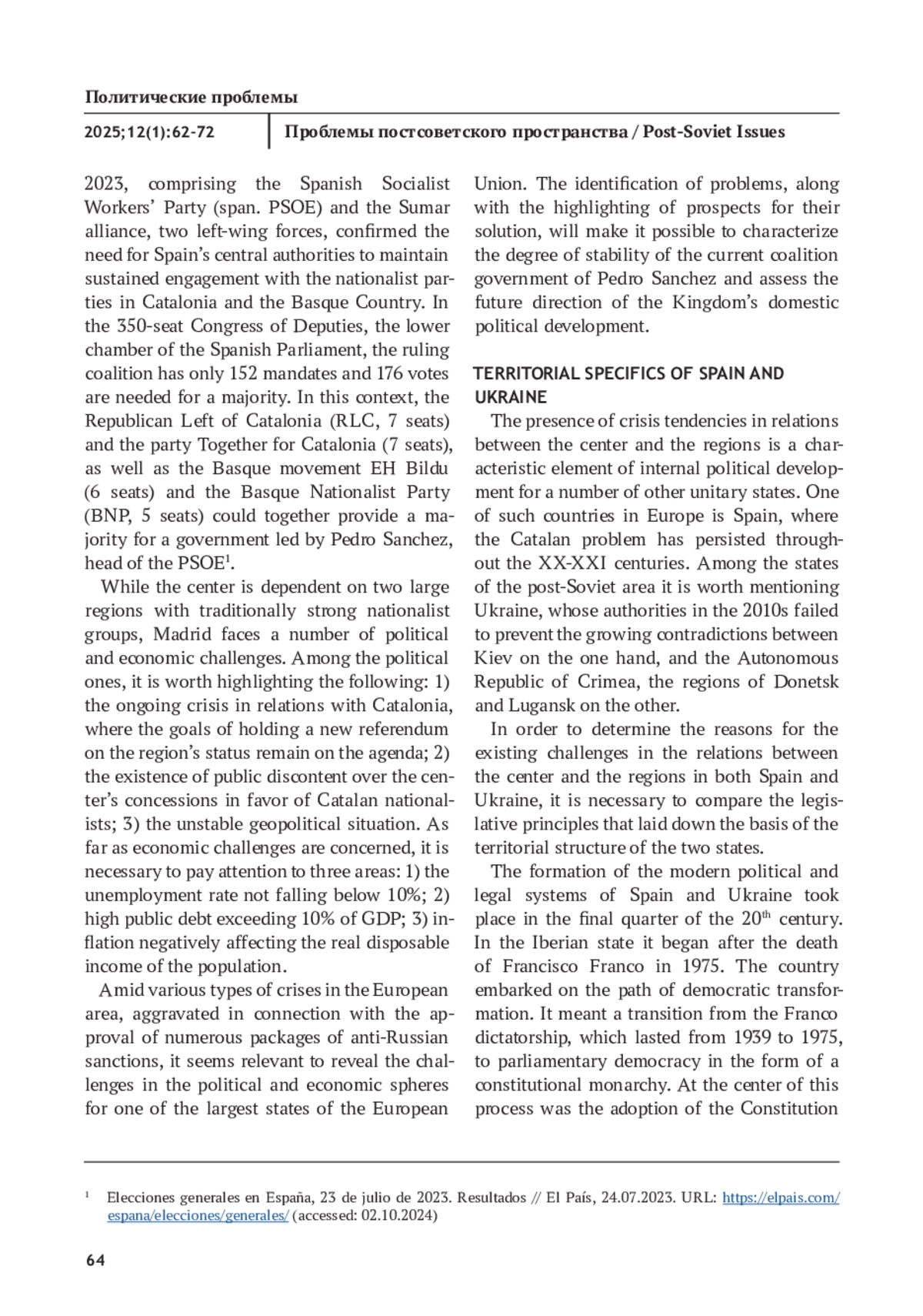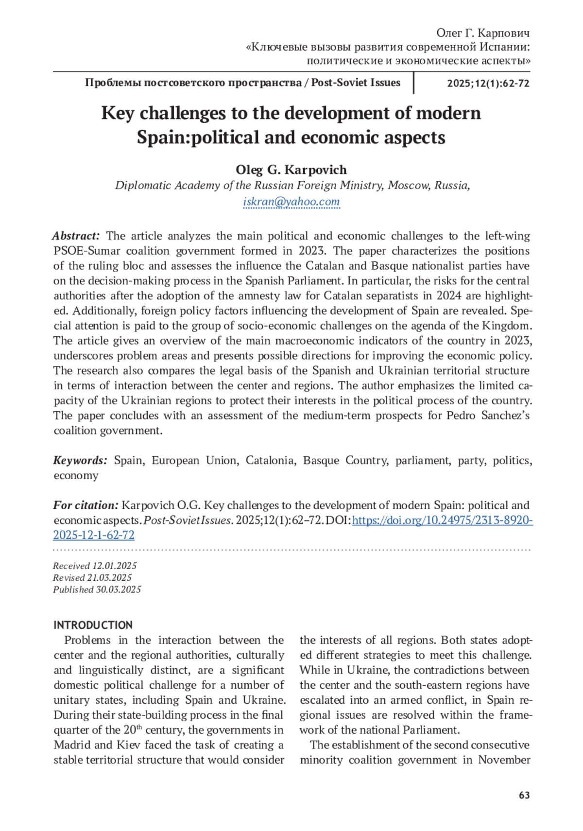 Статья посвящена анализу основных политических и экономических вызовов, стоящих перед сформированным в 2023 г. коалиционным правительством левых сил ИСРП-Сумар. В работе охарактеризованы позиции правящего блока и дана оценка влиянию националистических партий Каталонии и Страны Басков на механизм выработки решений в испанском парламенте. В частности, отмечены появившиеся для центральных властей риски, связанные с принятием в 2024 г. закона об амнистии каталонских политиков. Помимо этого, выявлены внешнеполитические факторы, влияющие на развитие Испании. Отдельное внимание уделено группе социально-экономических вызовов на повестке дня королевства. Показана характеристика основных макроэкономических показателей Испании за 2023 г., выделены проблемные области и отмечены возможные направления для улучшения ситуации в кризисных зонах. В тексте также сопоставлены правовые основы территориального устройства Испании и Украины в части взаимодействия по линии центр-регионы. Автором подчеркнута ограниченность возможностей украинских областей по защите своих интересов в политическом процессе страны. В заключительной части работы приведена оценка среднесрочных перспектив устойчивости и успешности коалиционного правительства Педро Санчеса.