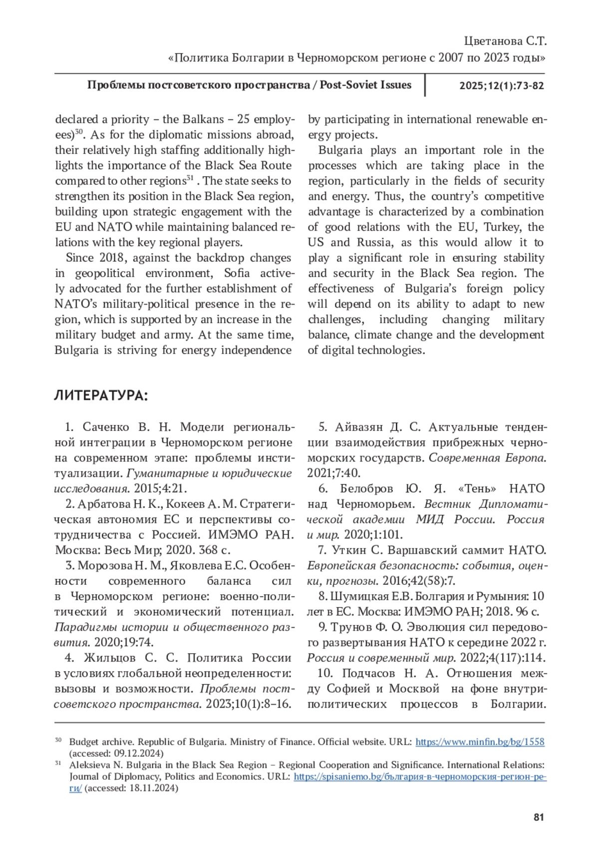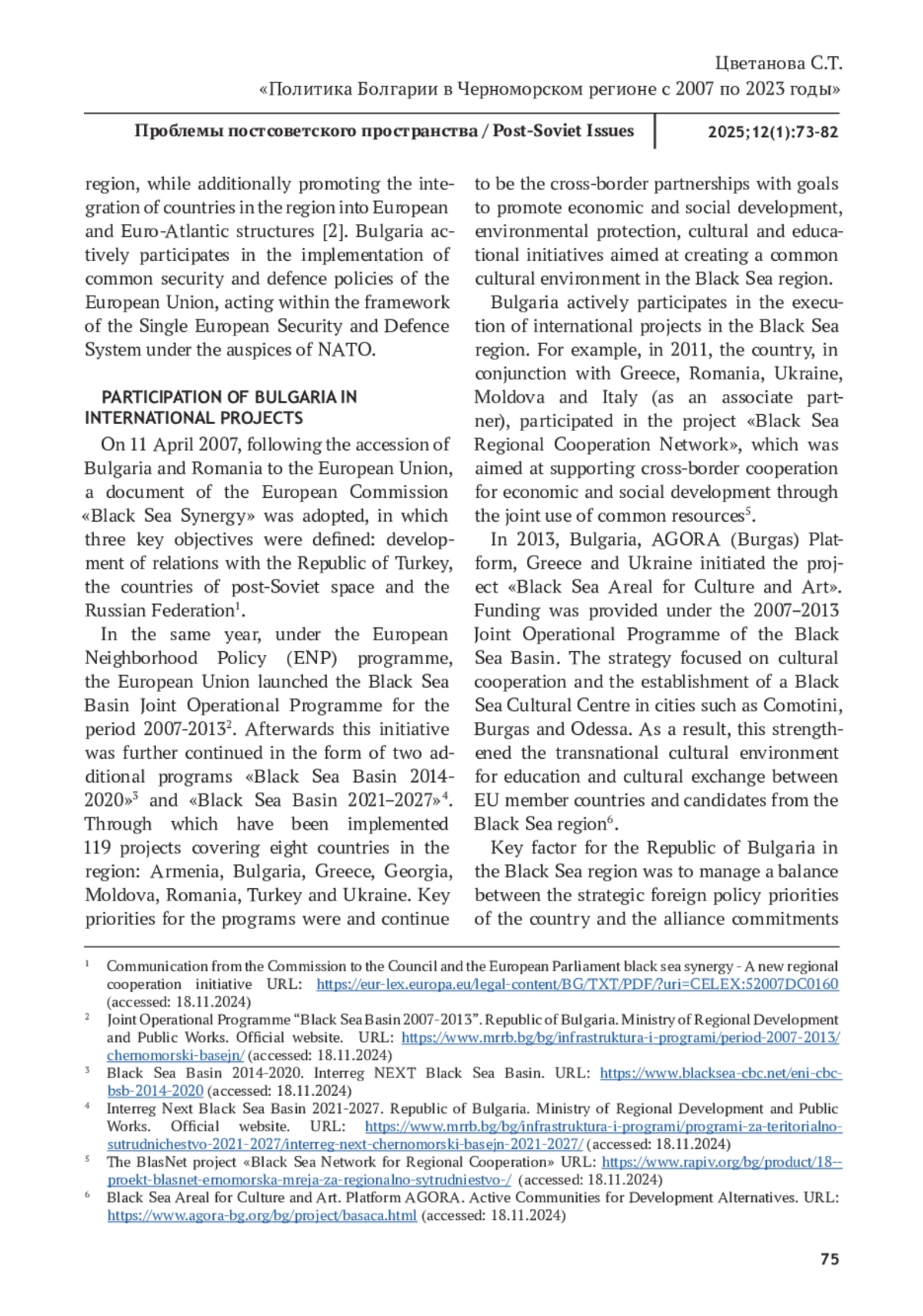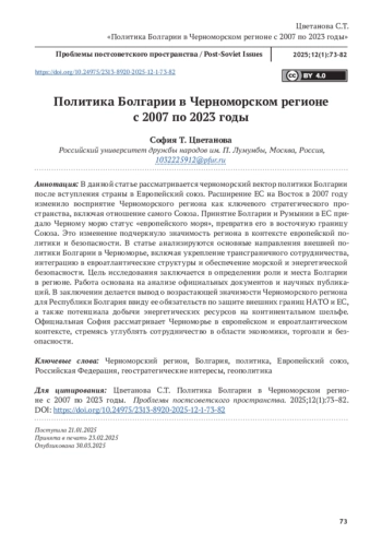 В данной статье рассматривается черноморский вектор политики Болгарии после вступления страны в Европейский союз. Расширение ЕС на Восток в 2007 году изменило восприятие Черноморского региона как ключевого стратегического пространства, включая отношение самого Союза. Принятие Болгарии и Румынии в ЕС придало Черному морю статус «европейского моря», превратив его в восточную границу Союза. Это изменение подчеркнуло значимость региона в контексте европейской политики и безопасности. В статье анализируются основные направления внешней политики Болгарии в Черноморье, включая укрепление трансграничного сотрудничества, интеграцию в евроатлантические структуры и обеспечение морской и энергетической безопасности. Цель исследования заключается в определении роли и места Болгарии в регионе. Работа основана на анализе официальных документов и научных публикаций. В заключении делается вывод о возрастающей значимости Черноморского региона для Республики Болгария ввиду ее обязательств по защите внешних границ НАТО и ЕС, а также потенциала добычи энергетических ресурсов на континентальном шельфе. Официальная София рассматривает Черноморье в европейском и евроатлантическом контексте, стремясь углублять сотрудничество в области экономики, торговли и безопасности.