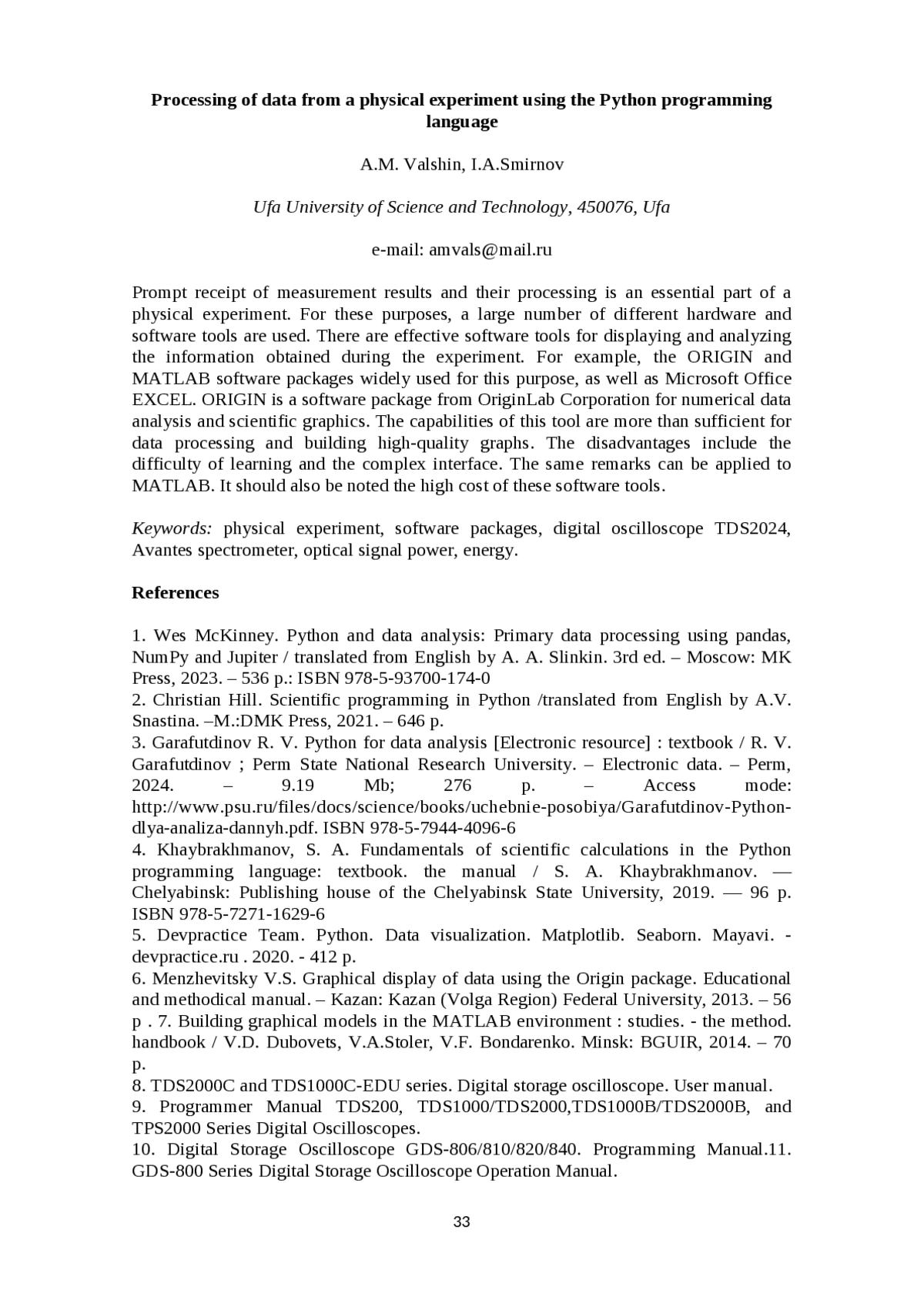 ВАЛЬШИН А. М., СМИРНОВ И.А. ОБРАБОТКА ДАННЫХ ФИЗИЧЕСКОГО ЭКСПЕРИМЕНТА С ИСПОЛЬЗОВАНИЕМ ЯЗЫКА ПРОГРАММИРОВАНИЯ PYTHON // ЛАЗЕРЫ. ИЗМЕРЕНИЯ. ИНФОРМАЦИЯ. 2024. № 4 (16), ТОМ 4
