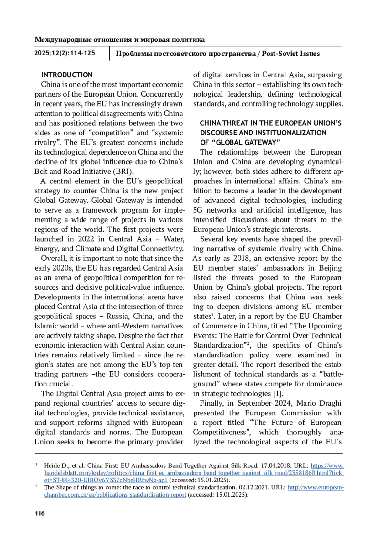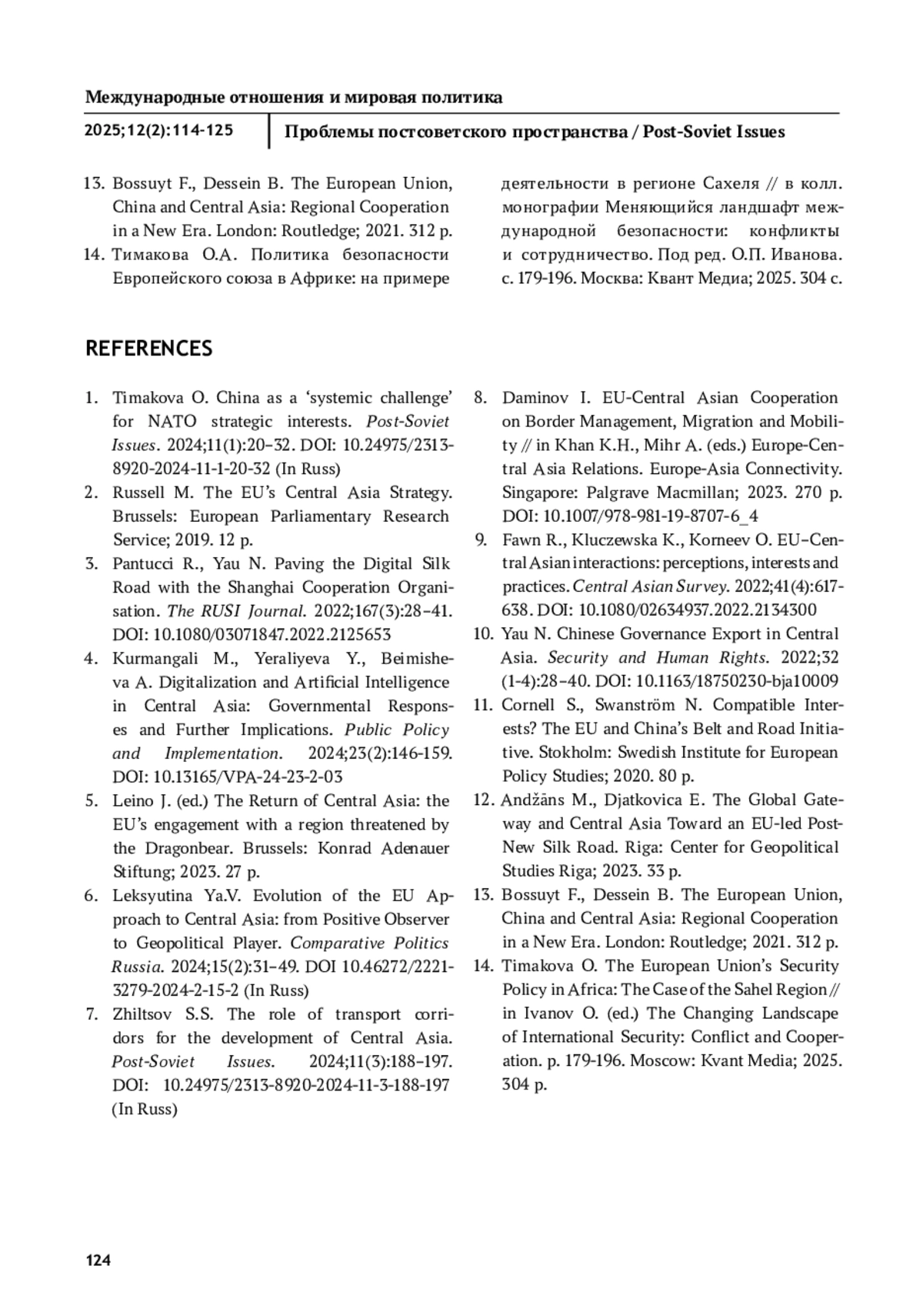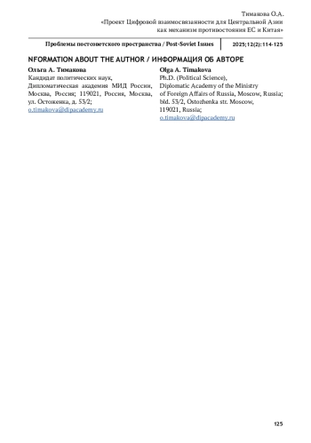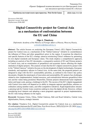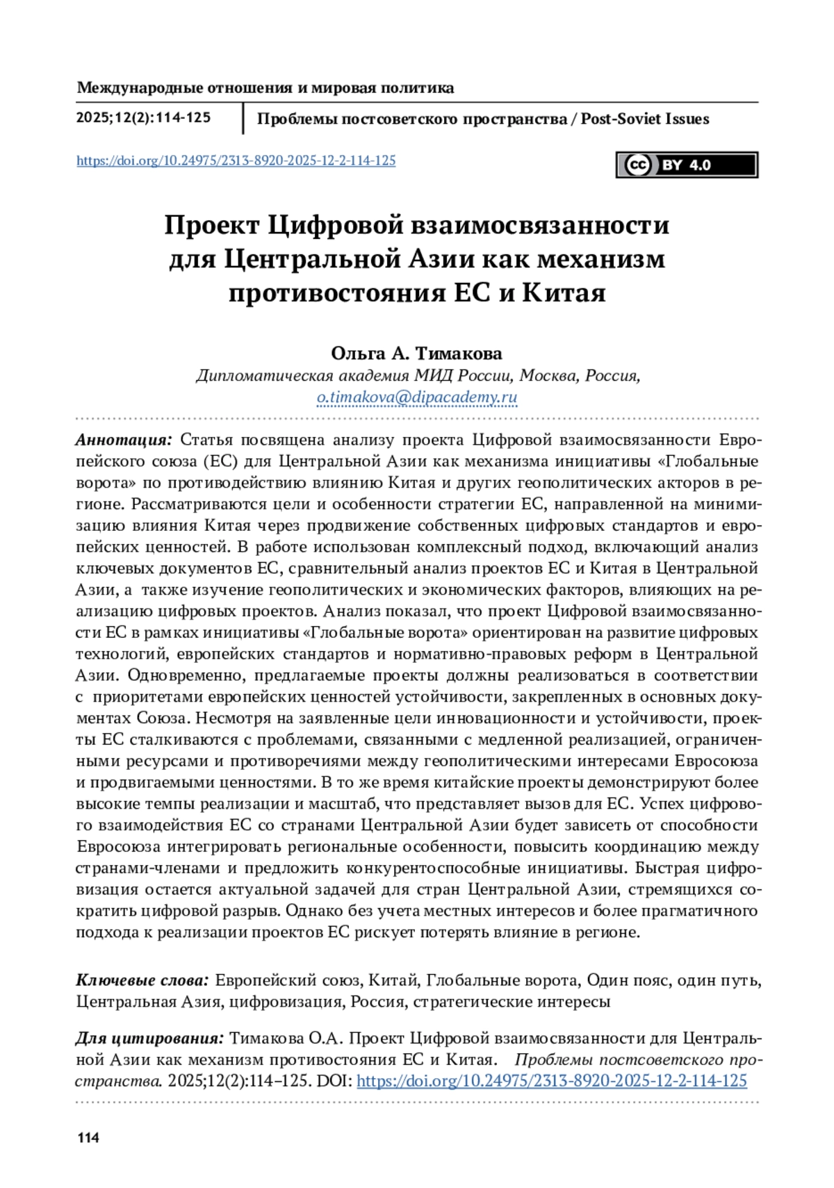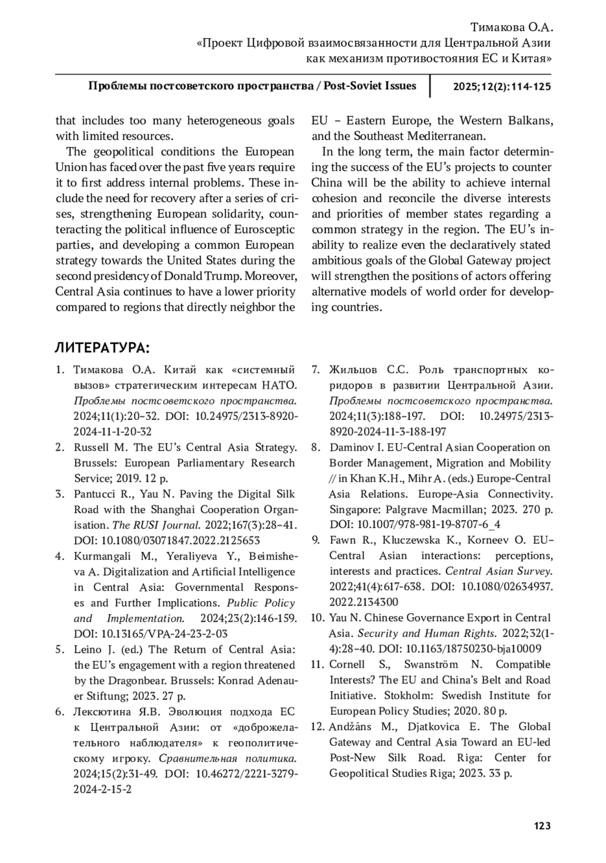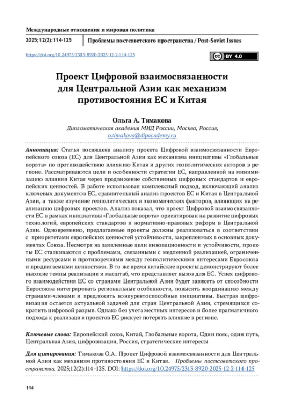 ТИМАКОВА О. А. ПРОЕКТ ЦИФРОВОЙ ВЗАИМОСВЯЗАННОСТИ ДЛЯ ЦЕНТРАЛЬНОЙ АЗИИ КАК МЕХАНИЗМ ПРОТИВОСТОЯНИЯ ЕС И КИТАЯ // ПРОБЛЕМЫ ПОСТСОВЕТСКОГО ПРОСТРАНСТВА. 2025. ТОМ 12, № 2