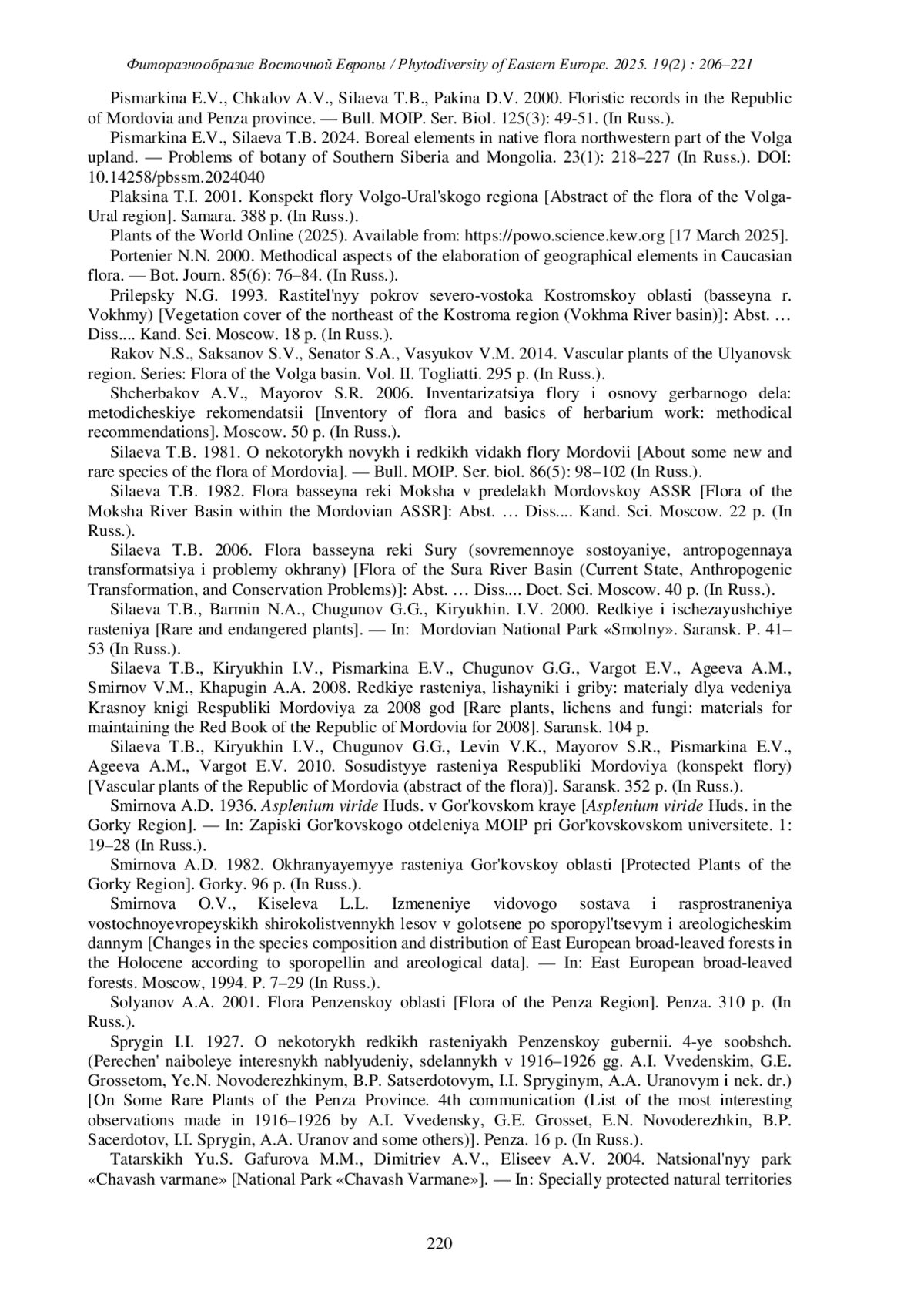 27. [Pismarkina, Silaeva] Письмаркина Е.В., Силаева Т.Б. 2024. Бореальные элементы флоры на северо-западе Приволжской возвышенности. - Проблемы ботаники Южной Сибири и Монголии. 23(1): 218-227. DOI: 10.14258/pbssm.2024040 EDN: ZLESPE