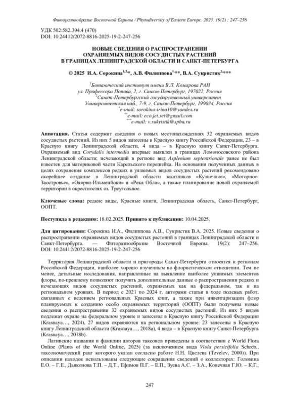 В период с 2021 по 2024 г. авторами статьи в ходе полевых работ, связанных с ведением региональных Красных книг, а также при инвентаризации флор планируемых к созданию особо охраняемых территорий (ООПТ) были получены новые сведения о распространении 32 охраняемых видов сосудистых растений.