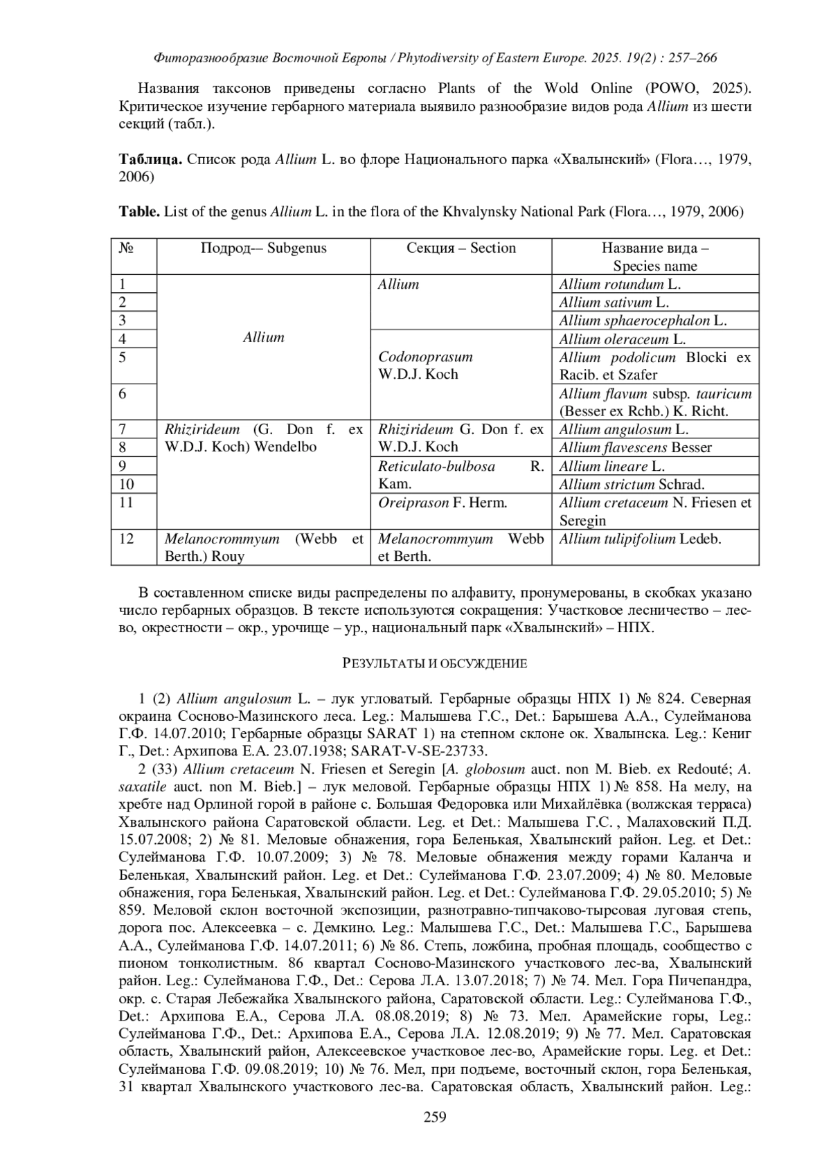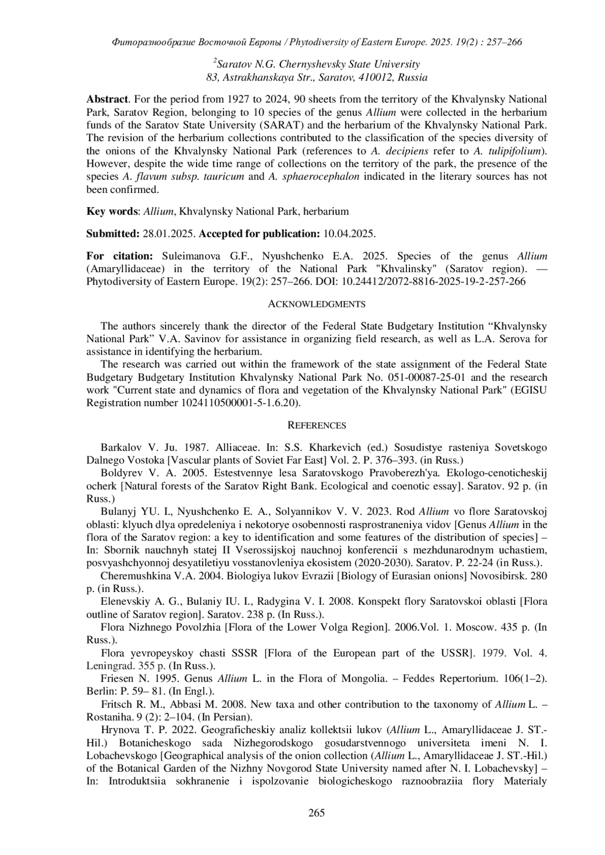 3. [Bulaniy et al.] Буланый Ю. И., Нющенко, Е. А., Солянников, В. В. 2023. Род Allium во флоре Саратовской области: ключ для определения и некоторые особенности распространения видов. - В кн.: Сборник научных статей II Всероссийской научной конференции с международным участием, посвящённой десятилетию восстановления экосистем (2020-2030). Саратов. С. 22-24.